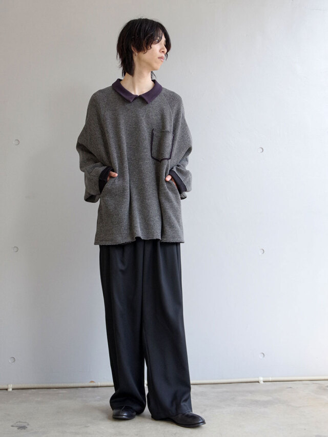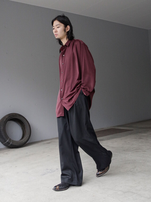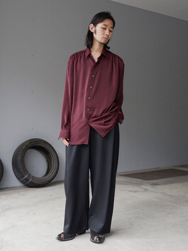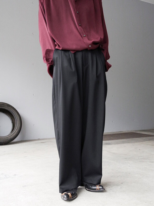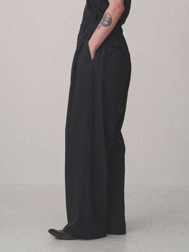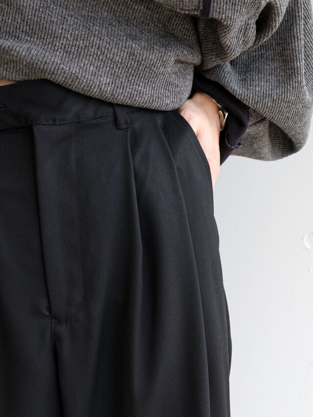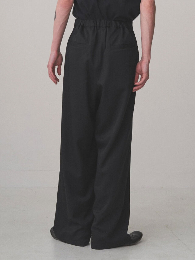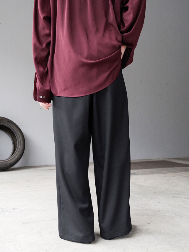 深めの2タックを配し、腰回りにたっぷりとゆとりを持たせながらも、ワイドシルエットを美しく仕上げています。後ろウエストにはゴムを内蔵し、快適なフィット感とリラックスした穿き心地を実現。