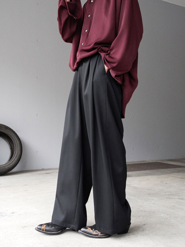 Featuring deep two pleats at the front, they offer generous room around the waist while maintaining a clean, ultra-wide silhouette. The back waistband is partially elasticated for a comfortable, adaptable fit.