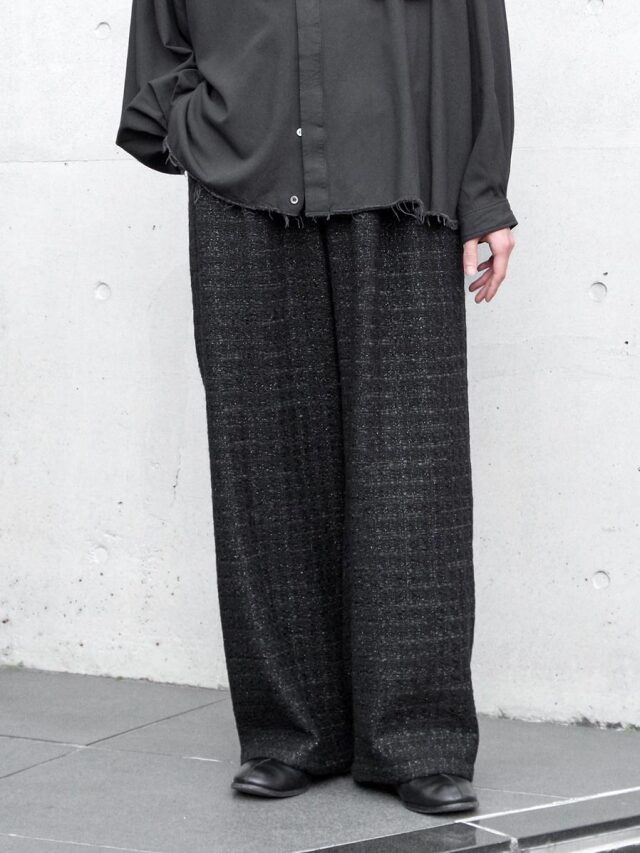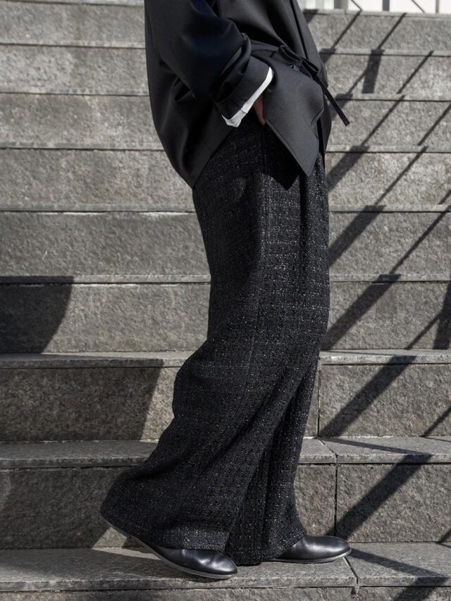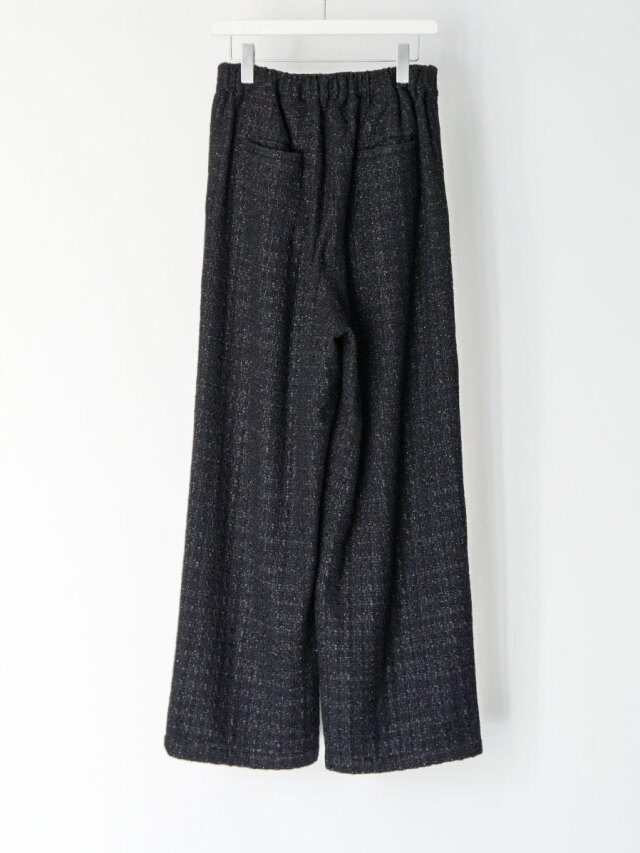 フロントに深めの2タックを配し、腰まわりにたっぷりとゆとりを持たせながらも、全体は美しいワイドシルエットにまとめられています。後ろウエストにはゴムを内蔵し、見た目の上品さを保ちながら、快適なフィット感とリラックスした穿き心地を実現しています。