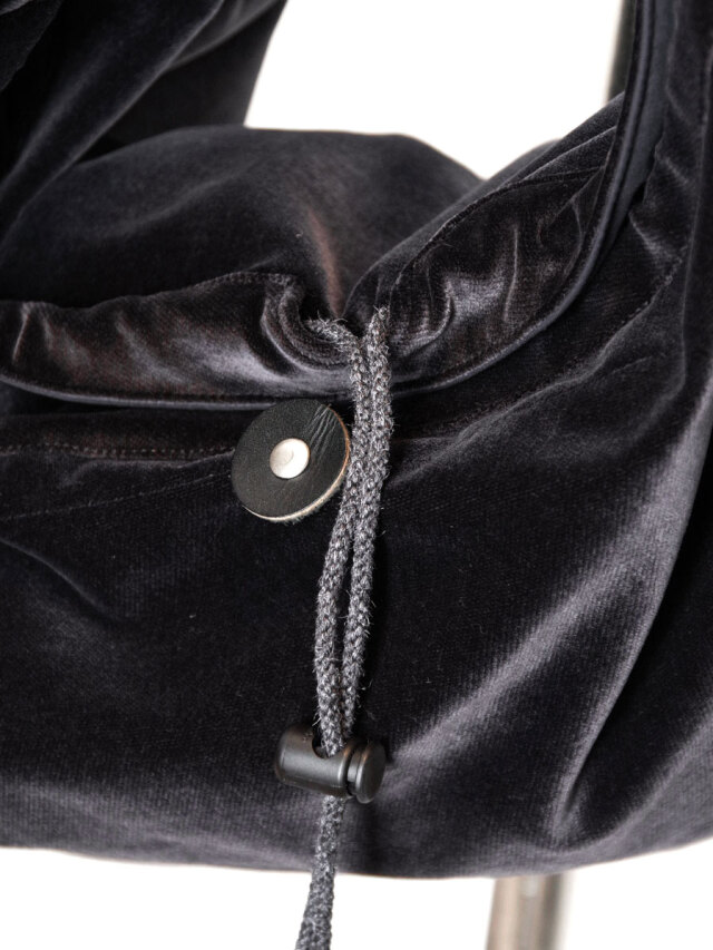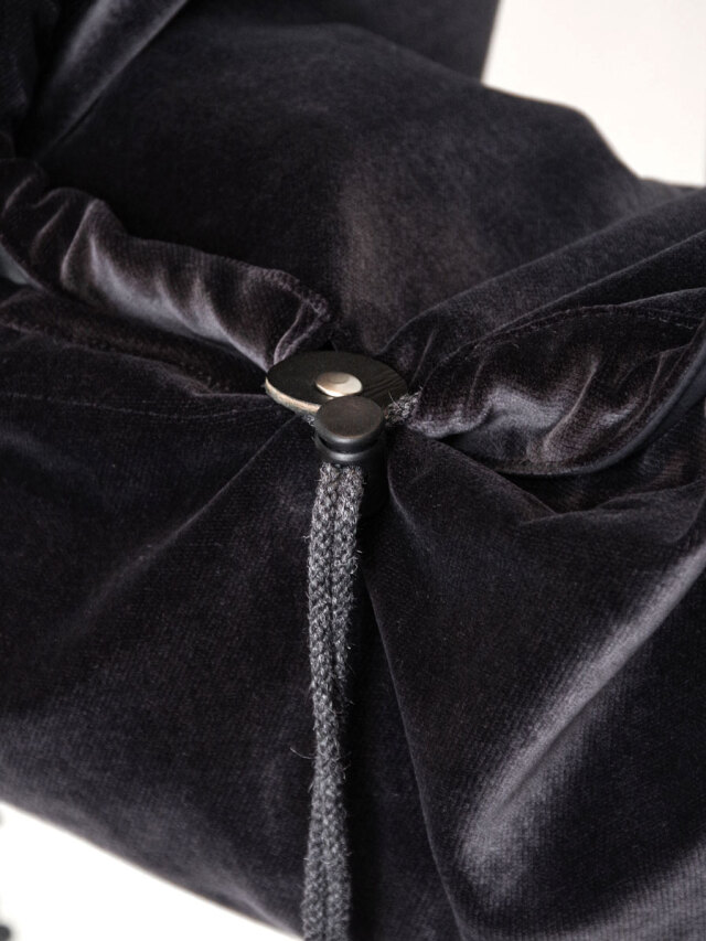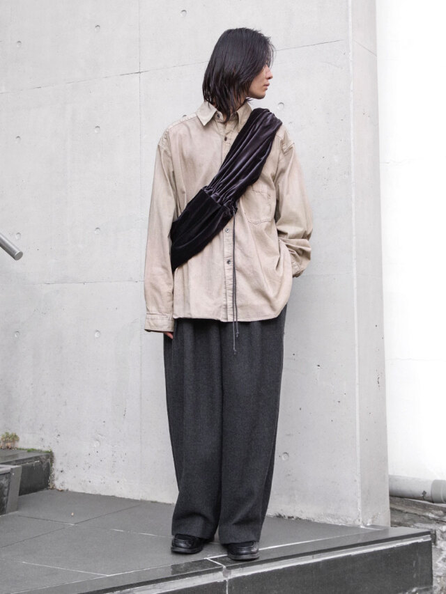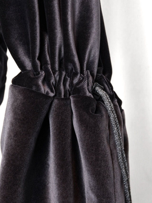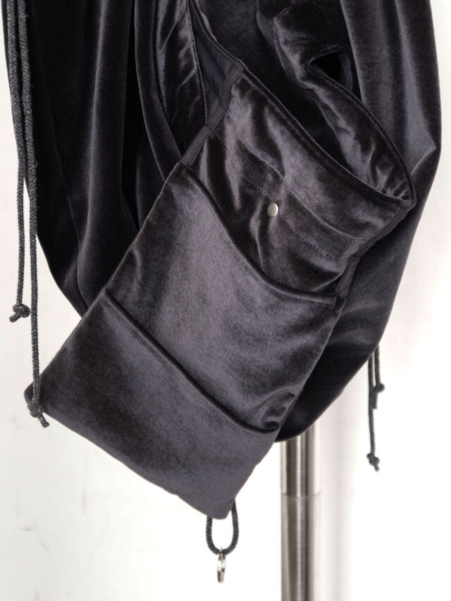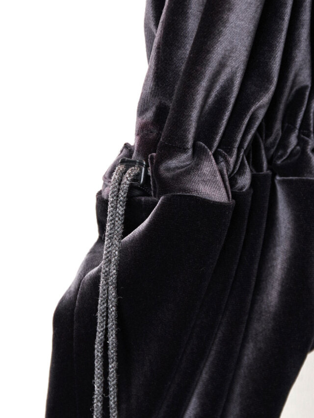 本作ではベルベット生地が採用され、毛並みが美しく上質な落ち感とドレープが形成される印象深い一品に。
