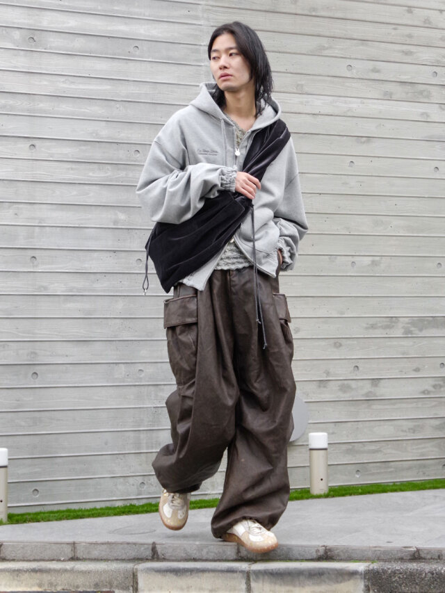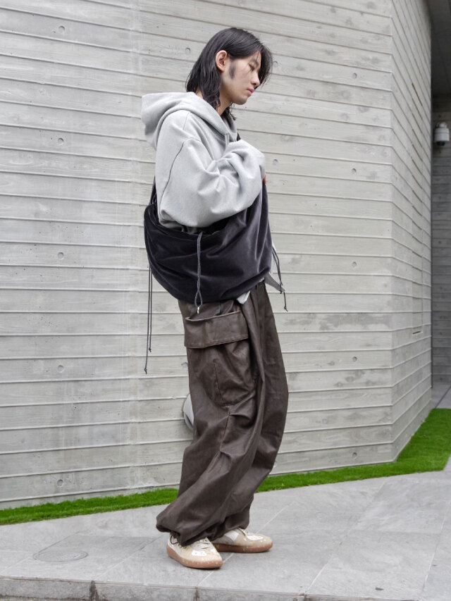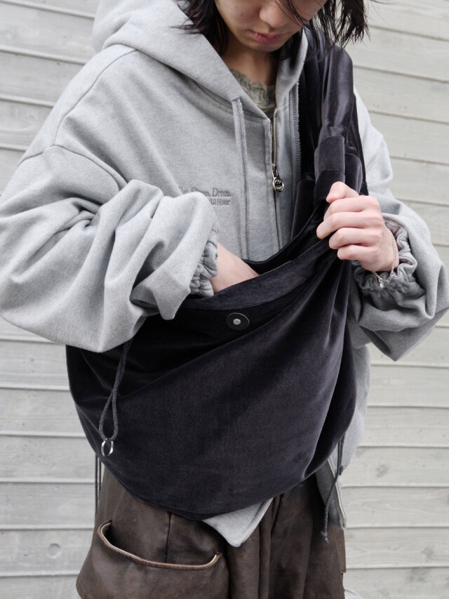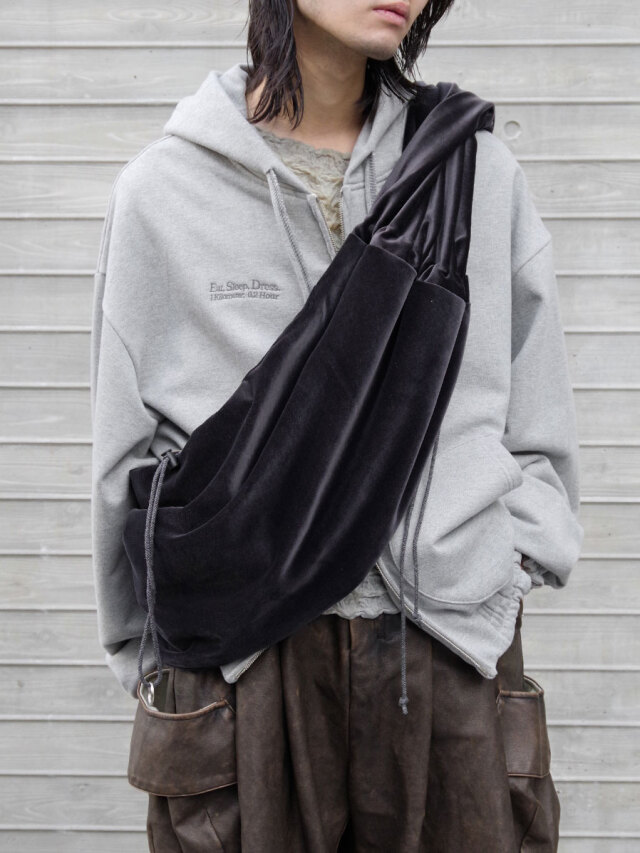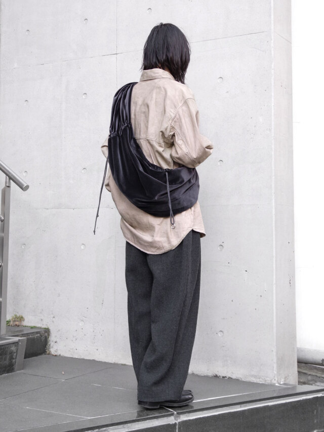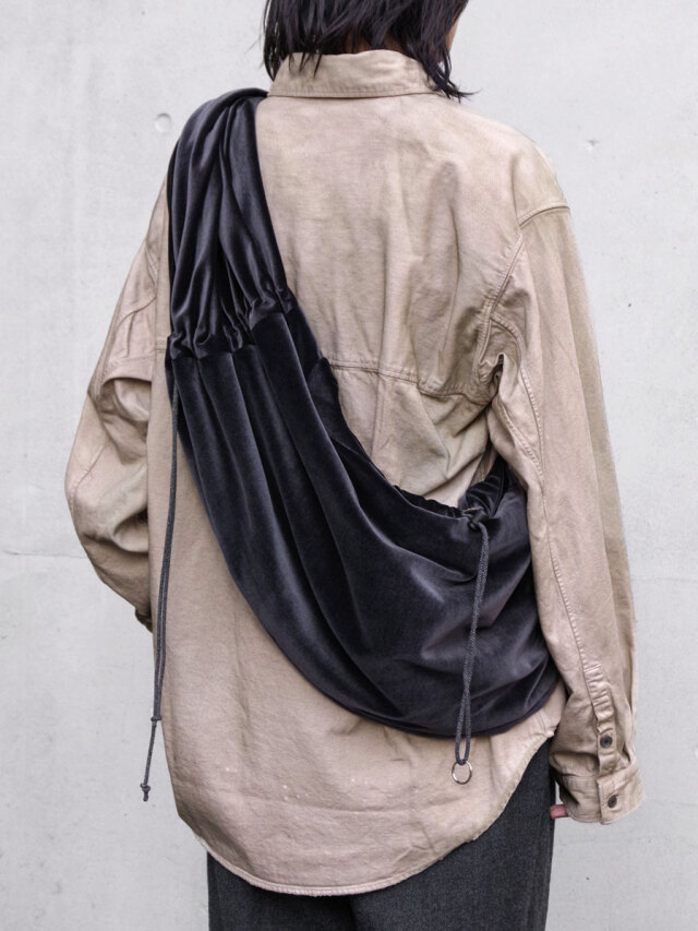 アジア圏の僧呂が身につける袈裟をデザインソースとした本作は、袋の入り口箇所と帯部分に設けられたドローコードでシルエットの調整が可能に。ドローコード先端には丸カンがつき、鍵などを取り付けるのにもぴったりで、内部には小分け用のポケットも配備されています。