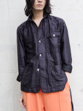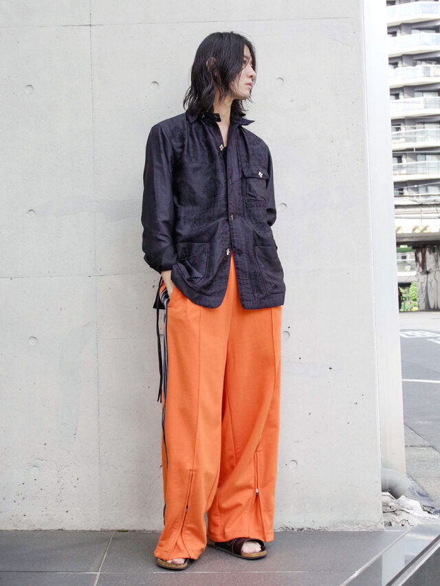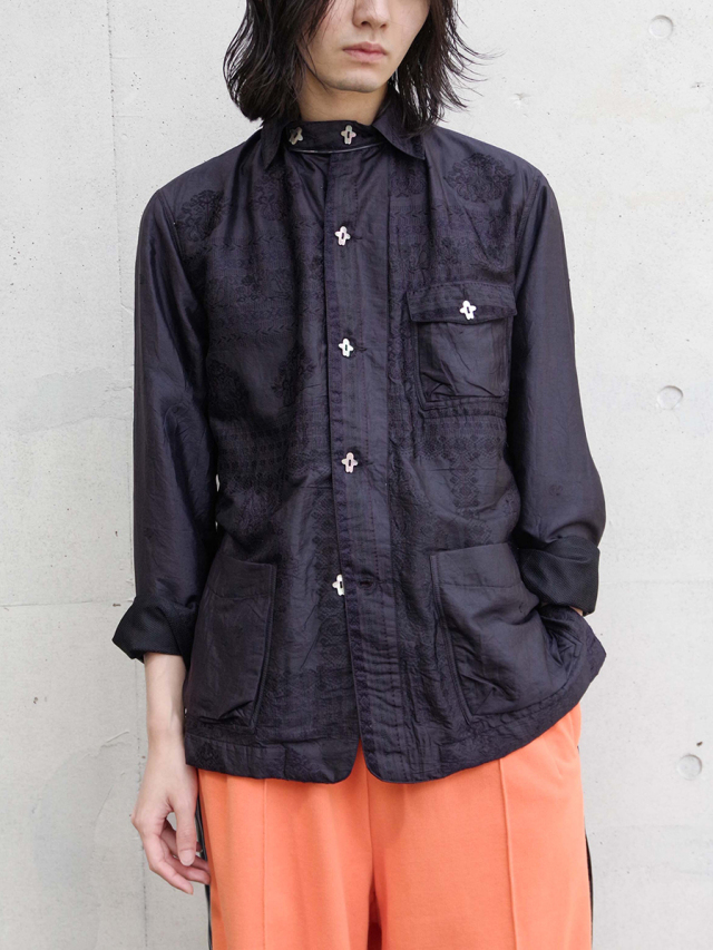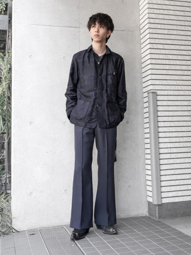 襟はバンド仕様でアクセントをプラス。ボタンには人の形をしたヴィンテージボタンを採用し、唯一無二の存在感を放つ一着です。
