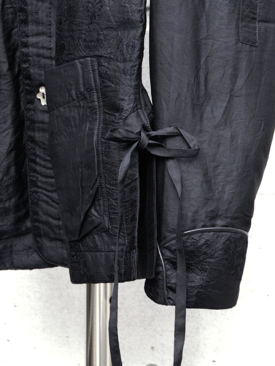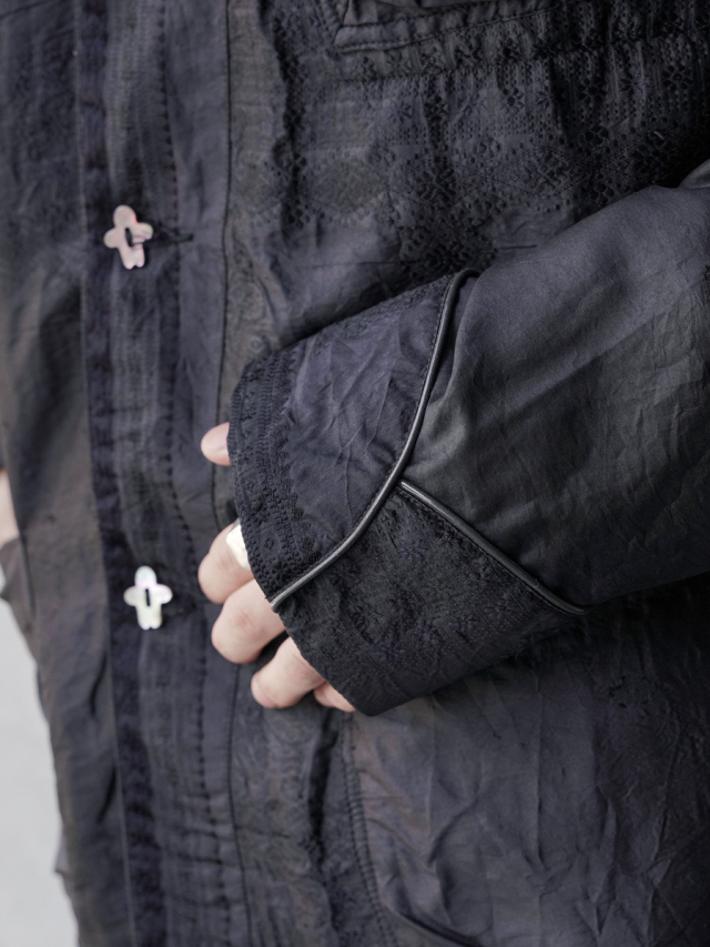 手織、手紡ぎで織られたナチュラルなシルクの質感に、サリー特有の装飾的な刺繍デザインを残しつつも、後染めでブラックカラーに染め上げることでモードな雰囲気を漂わせています。