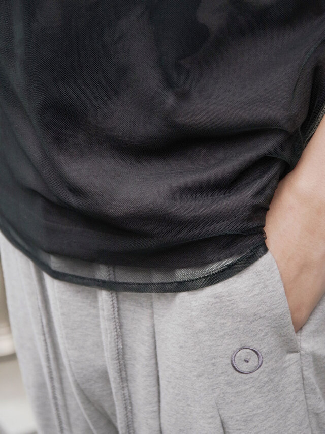 透け感のあるチュールの下に、肌当たりの良い天竺素材のボディを重ねたレイヤード構造により、視覚と着心地の両面に奥行きを持たせています。