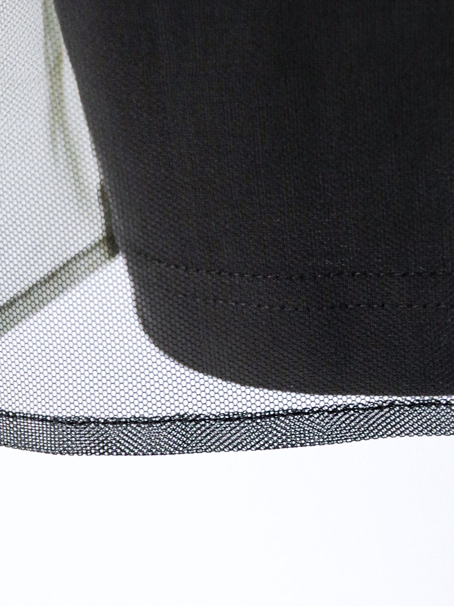 The tulle layer is printed with the reversed image of a 1900s frock coat, capturing the aged texture of the garment and even the original tags from the era.