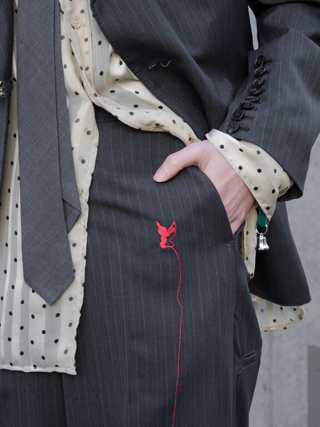 The red angel embroidery symbolizes a bridge between the wearer and the brand―a quiet expression of prayer.