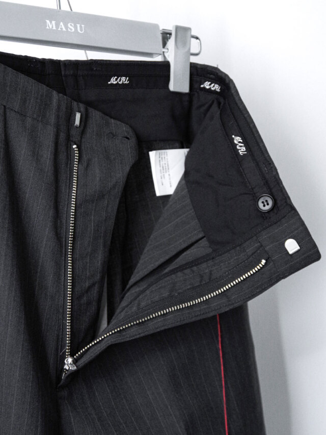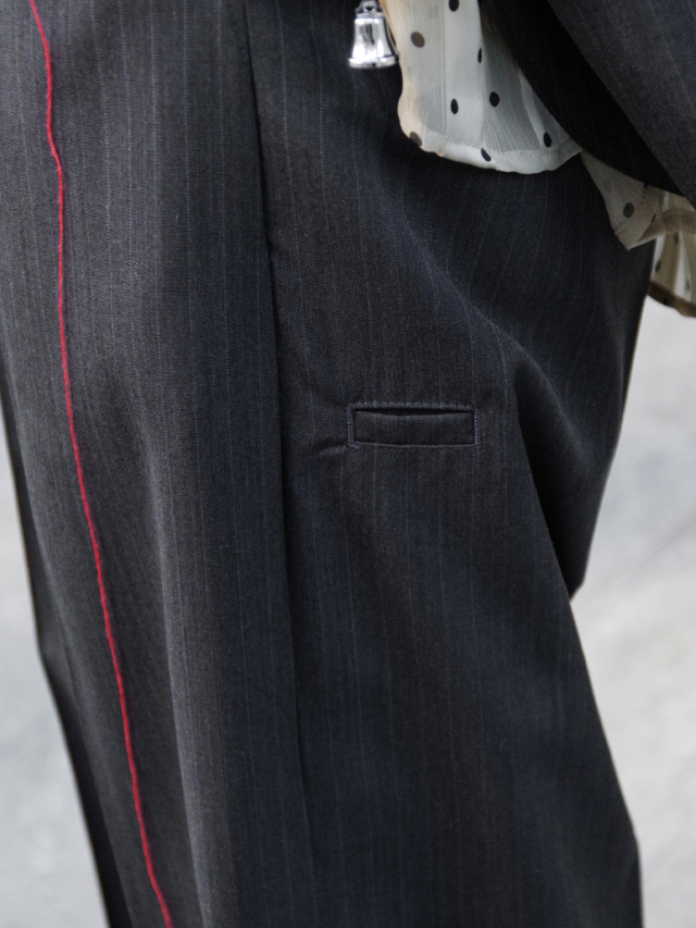 Worn as a set with the RED BAR TACK TAILORED JACKET in the same fabric, the look gains further cohesion and depth.