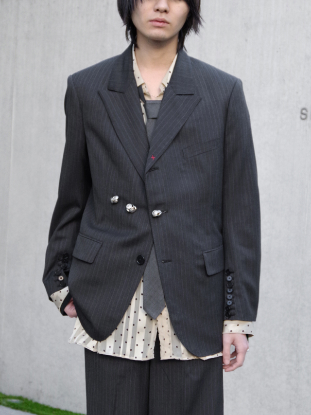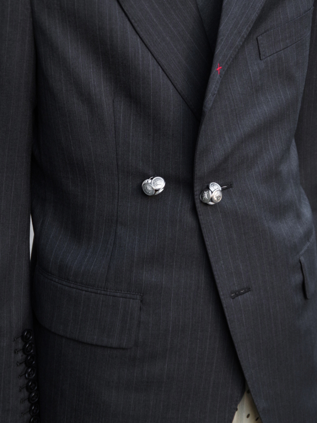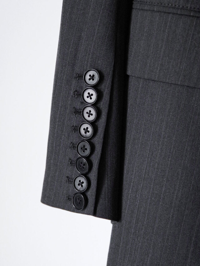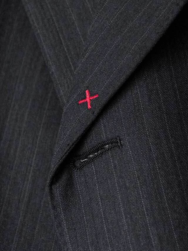 ラペルに施された赤い糸が交差するバータックもまた、仮縫いの際にピンで留められていた箇所を起点としたもの。
