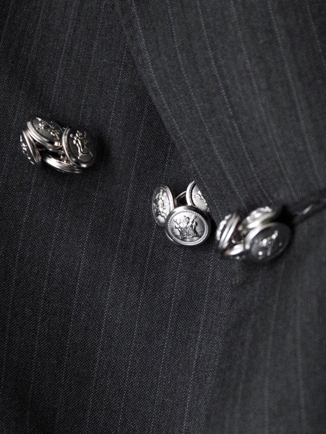 During the fitting process, buttons were casually gathered and pinned onto the garment.