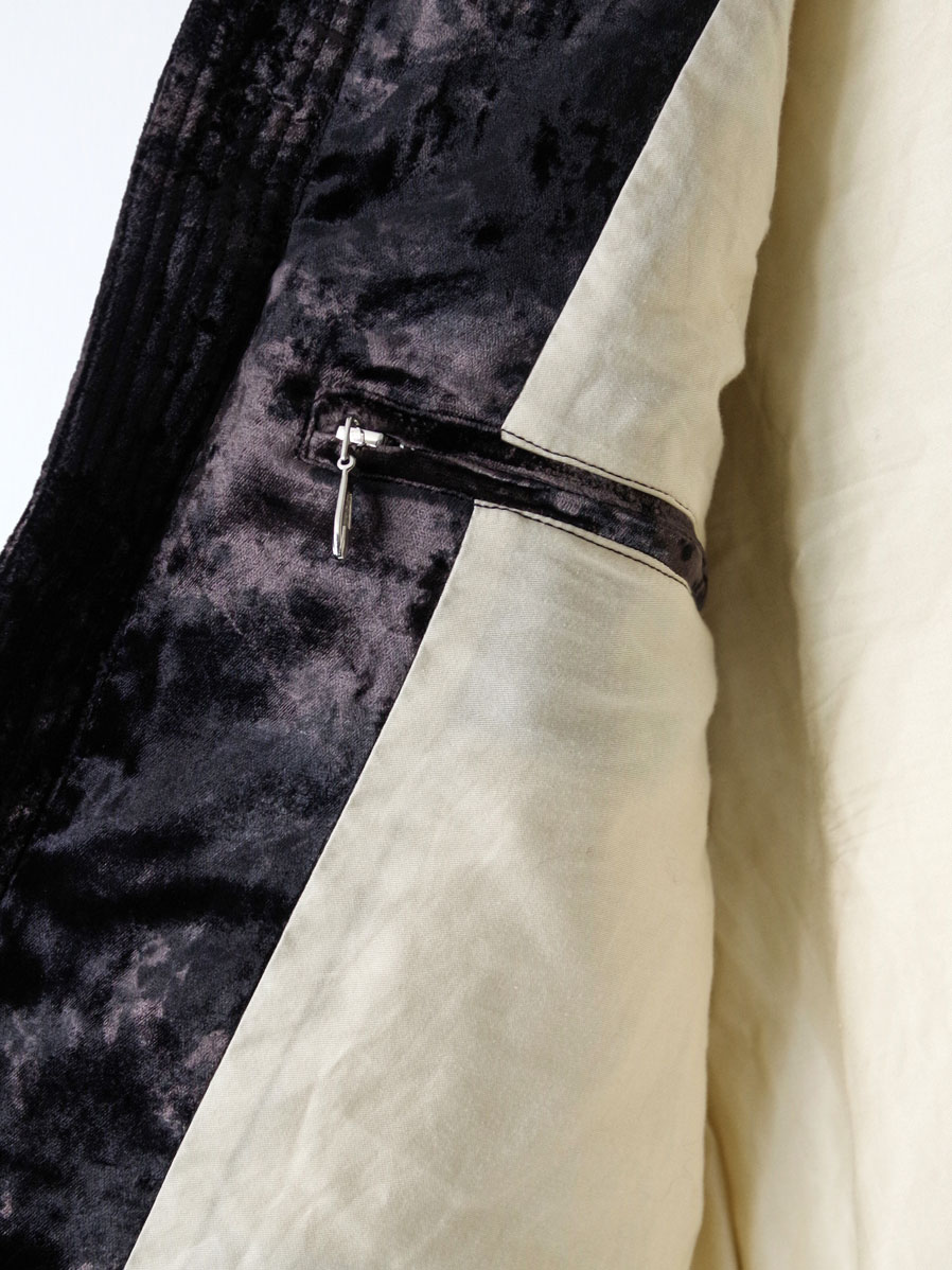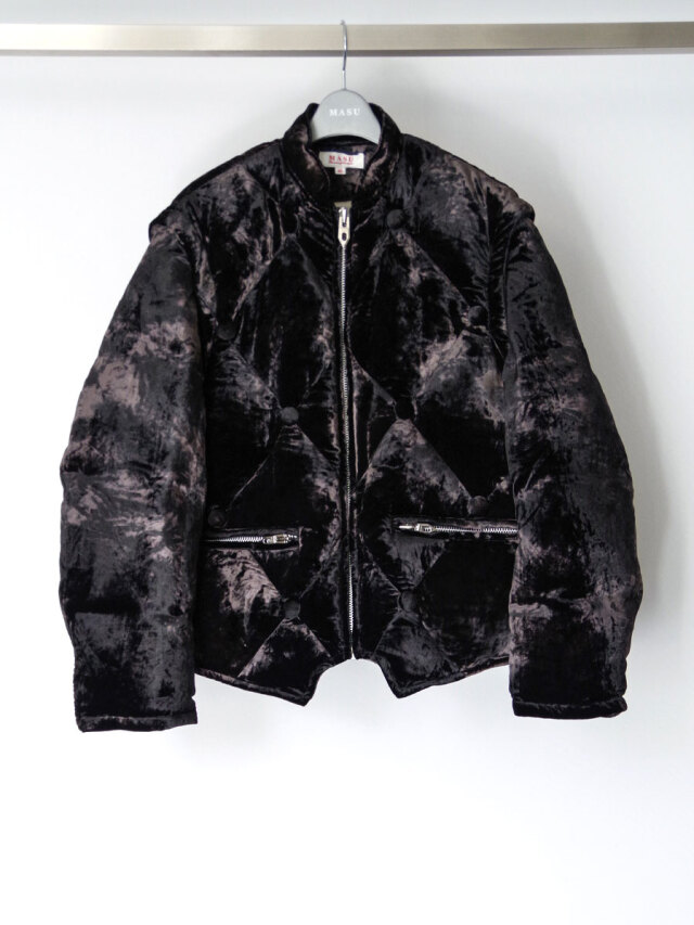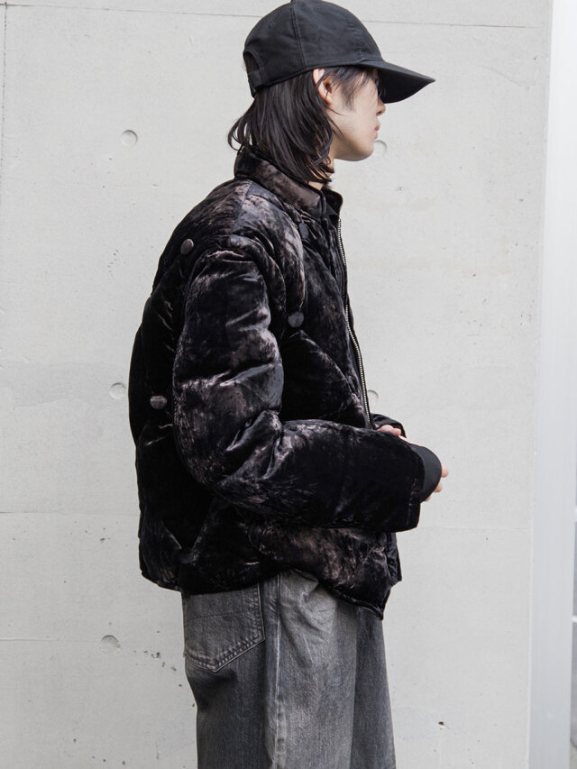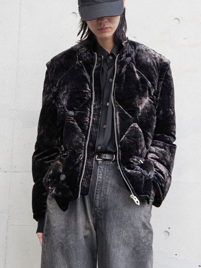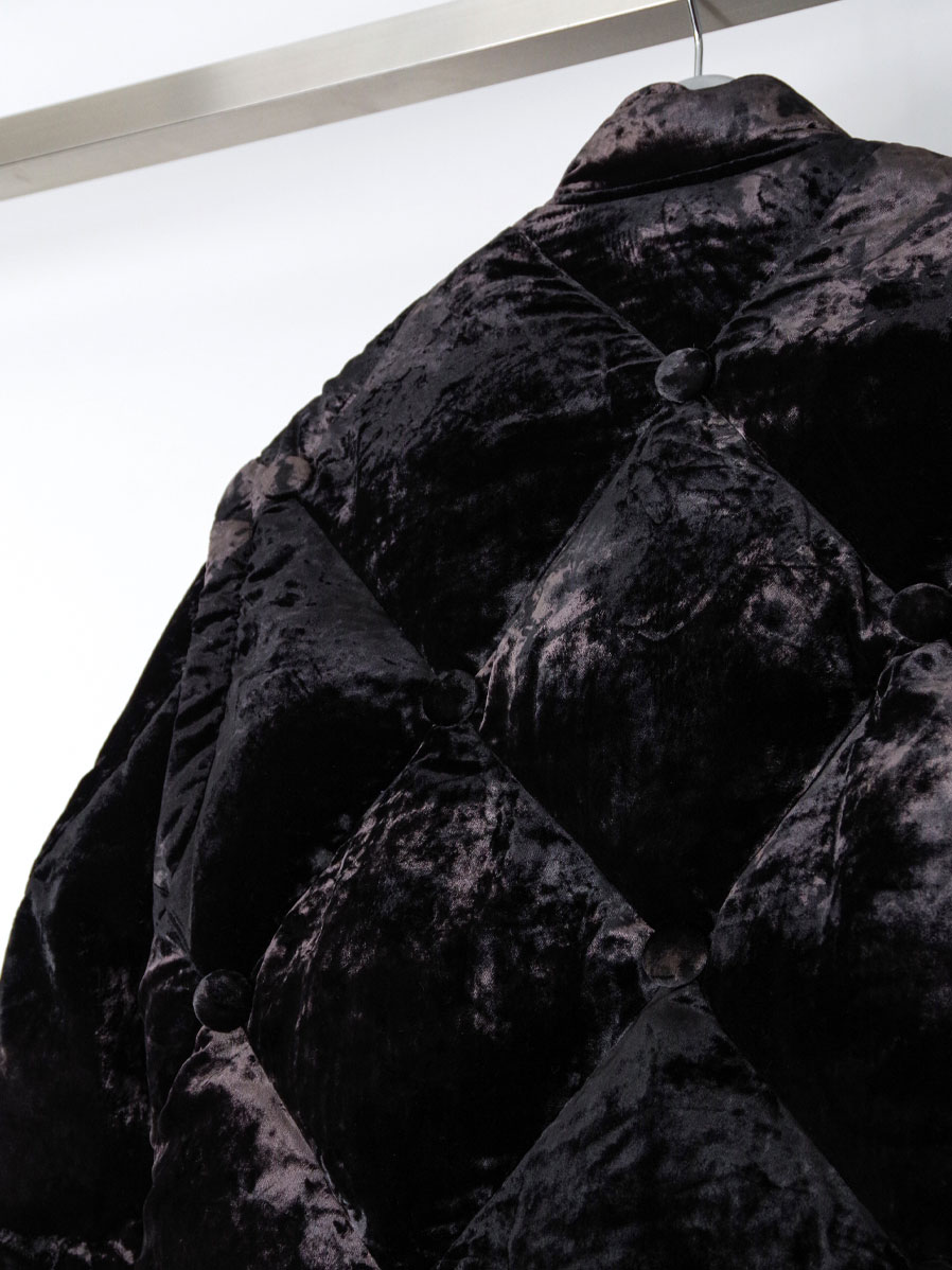A fully lined down jacket crafted from rich, three-tone gradient-dyed velvet, developed as an evolution of the fabric first introduced in the brand’s early “aged sofa” concept.