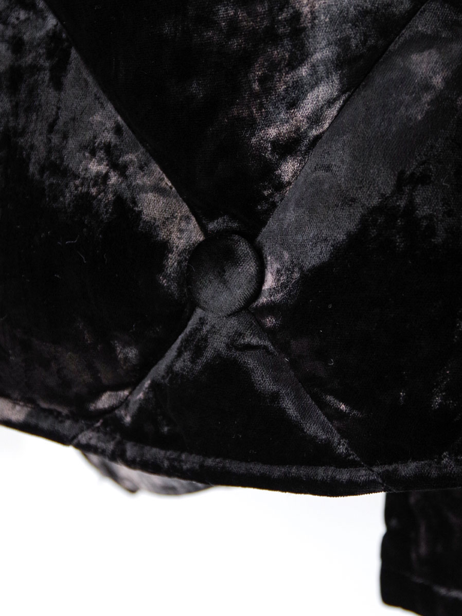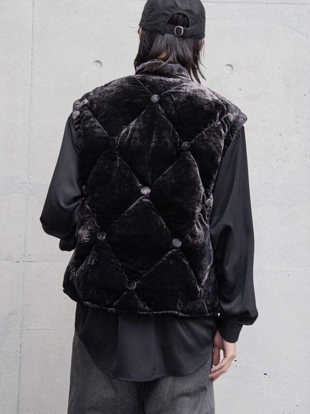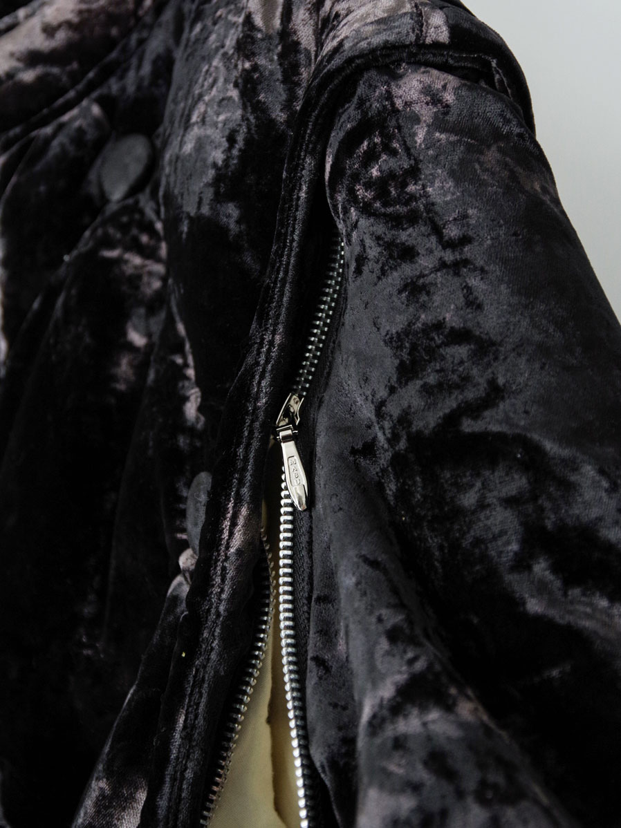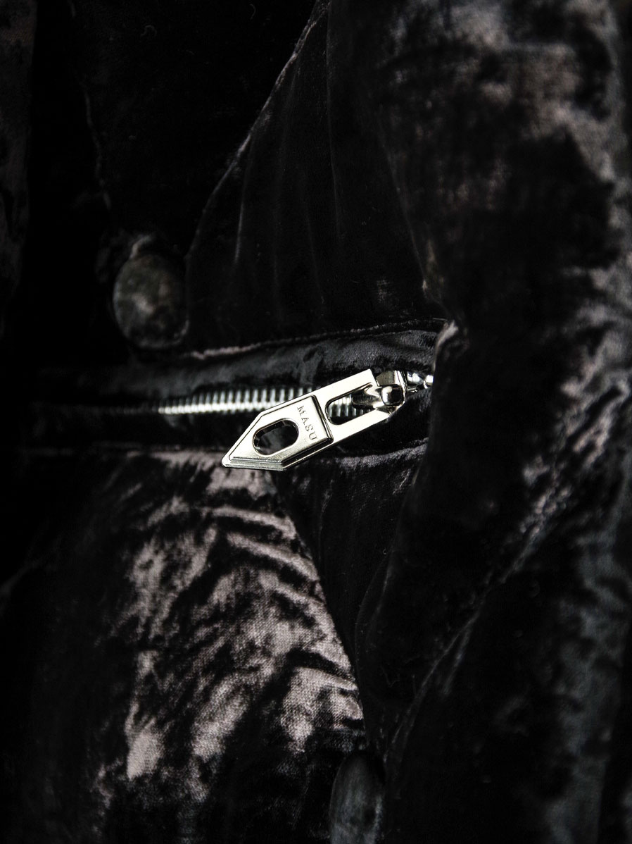 A fully lined down jacket crafted from rich, three-tone gradient-dyed velvet, developed as an evolution of the fabric first introduced in the brand’s early “aged sofa” concept.
