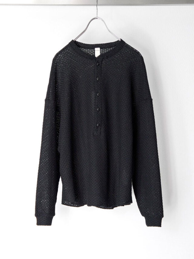 The deeply set henley neckline allows the impression around the neck to be adjusted depending on how the buttons are fastened, offering versatility from a relaxed to a more composed look.