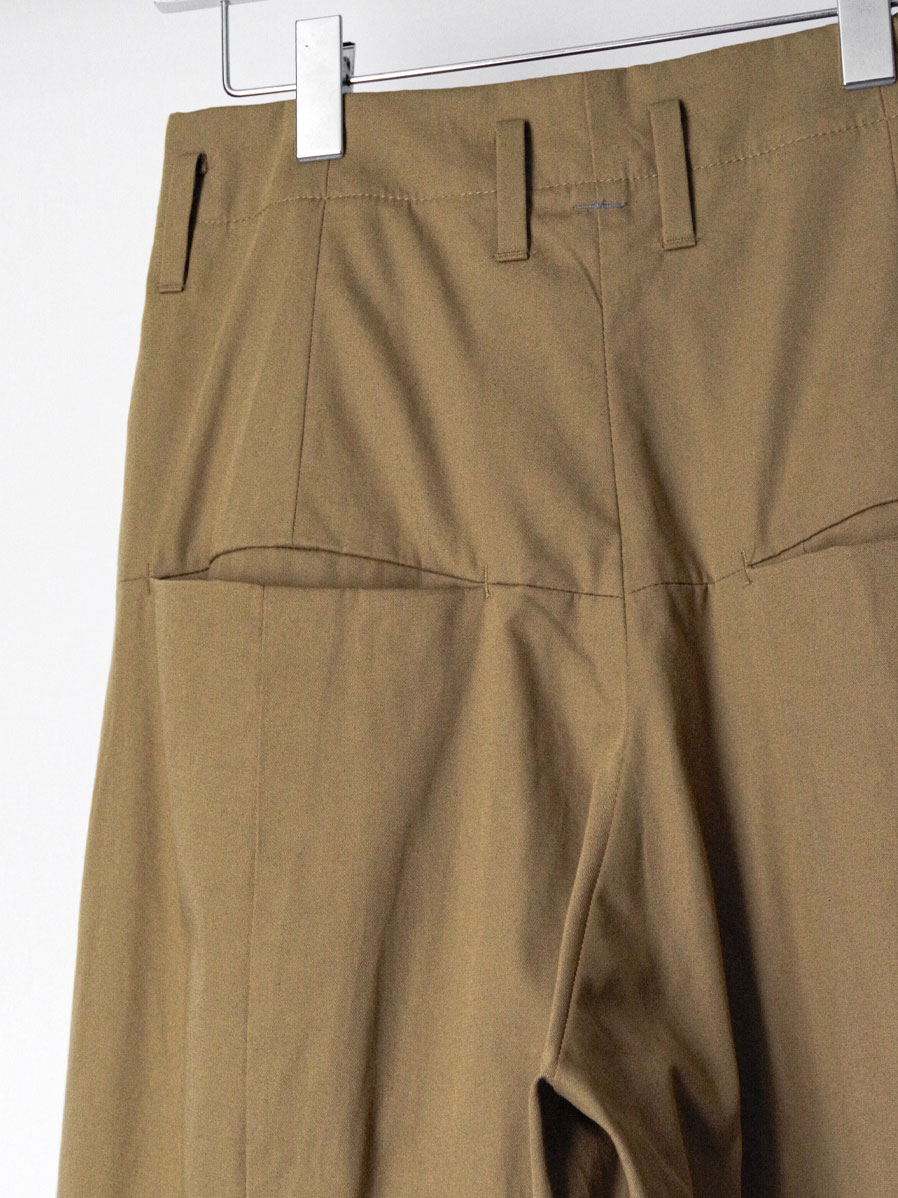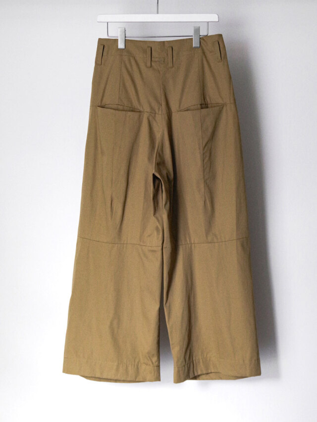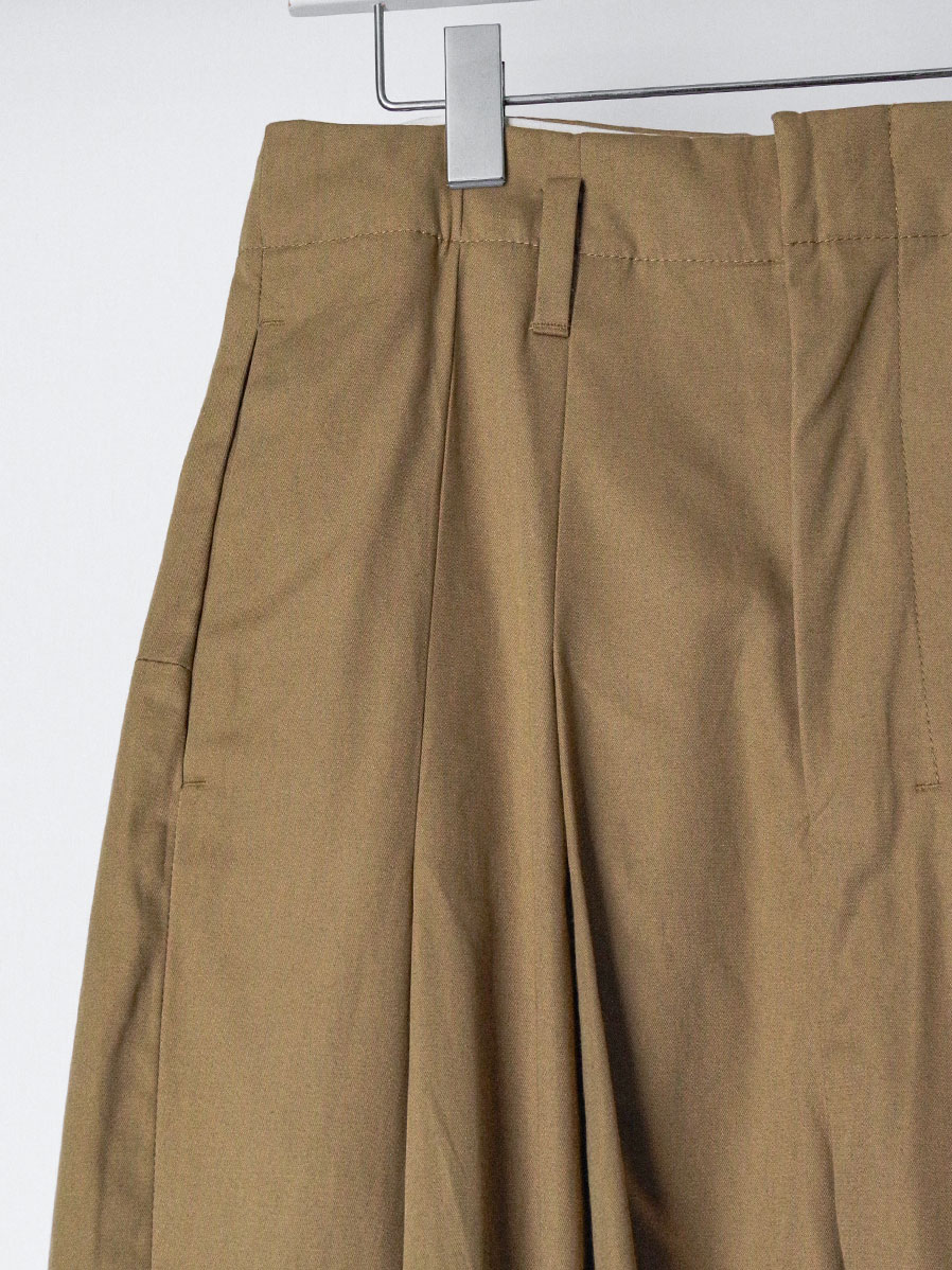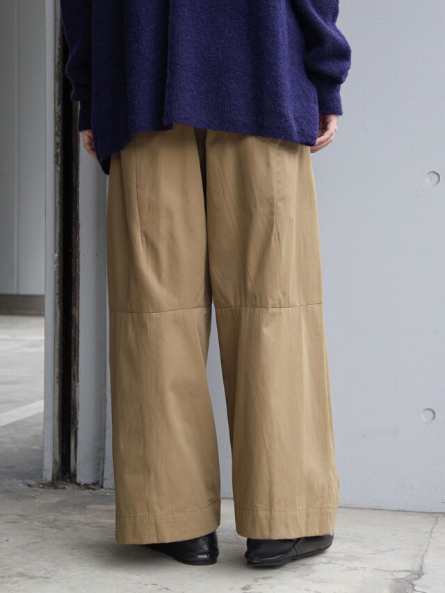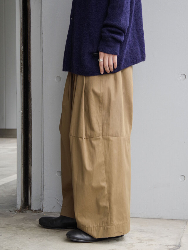 特筆すべきポイントはフロントにとられた深い2タック。こちらが筒状の膨らみをもたせ、前側の生地分量を多くとった立体的なシルエットに。ややハイウエストで着用していただくとよりその美しいラインが際立ちます。