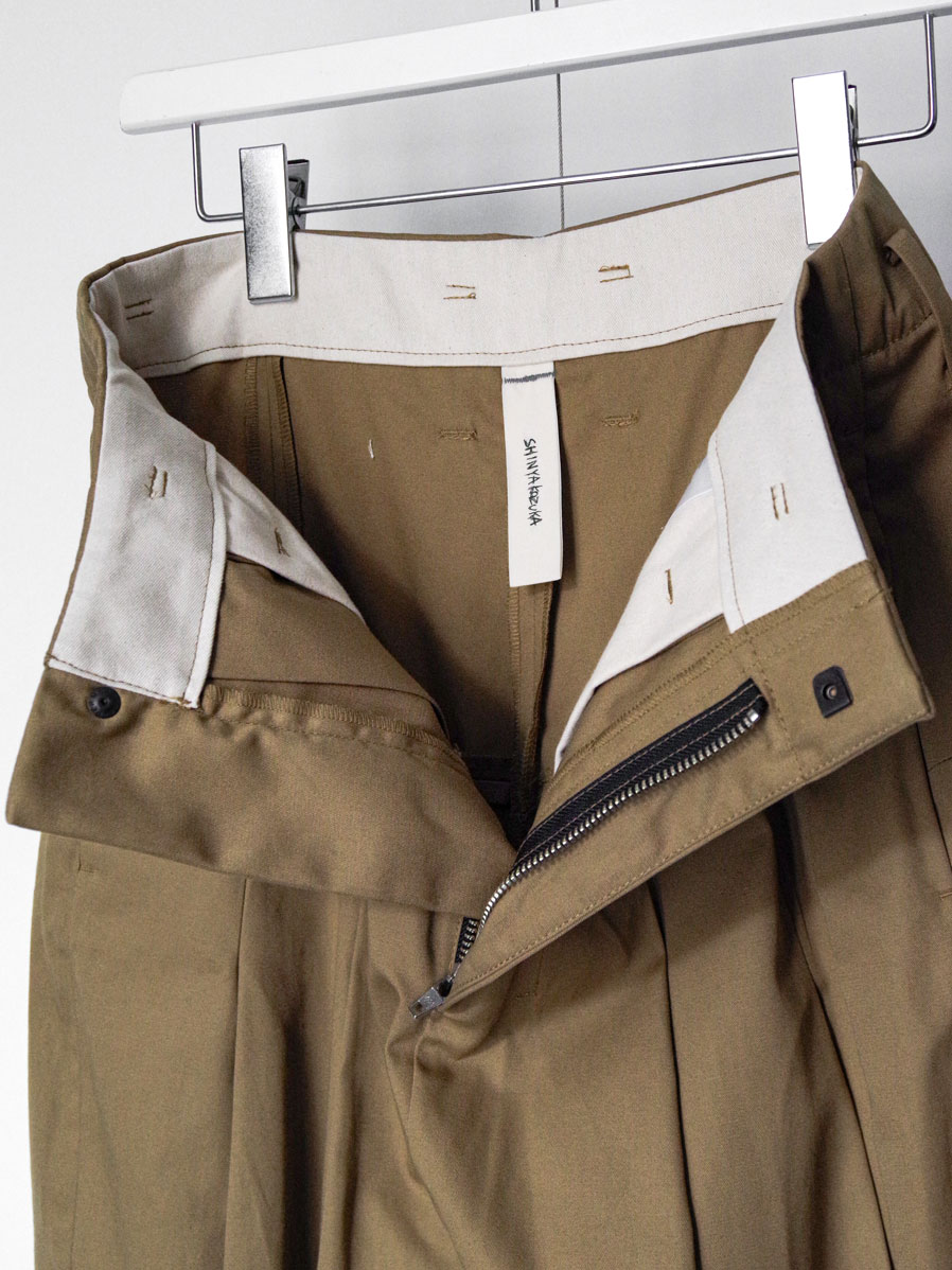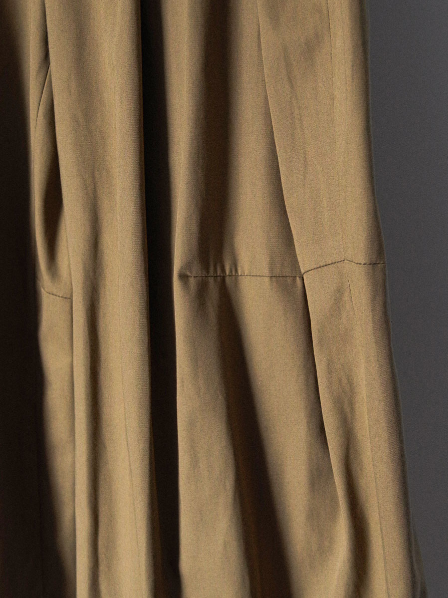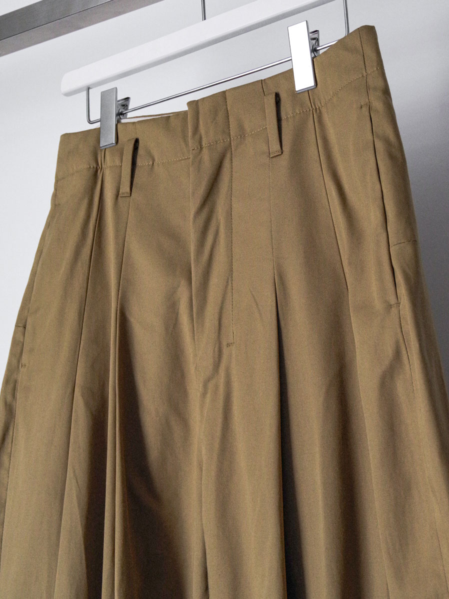 特筆すべきポイントはフロントにとられた深い2タック。こちらが筒状の膨らみをもたせ、前側の生地分量を多くとった立体的なシルエットに。ややハイウエストで着用していただくとよりその美しいラインが際立ちます。