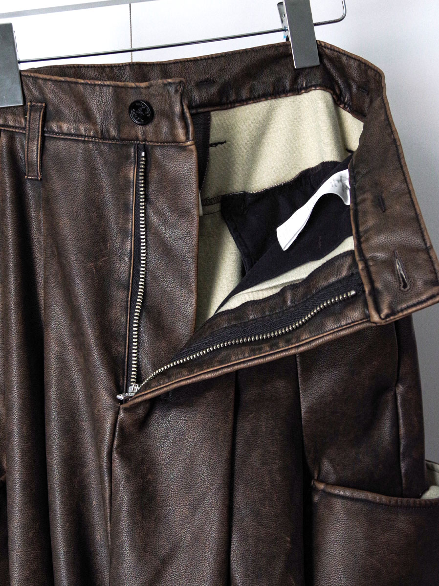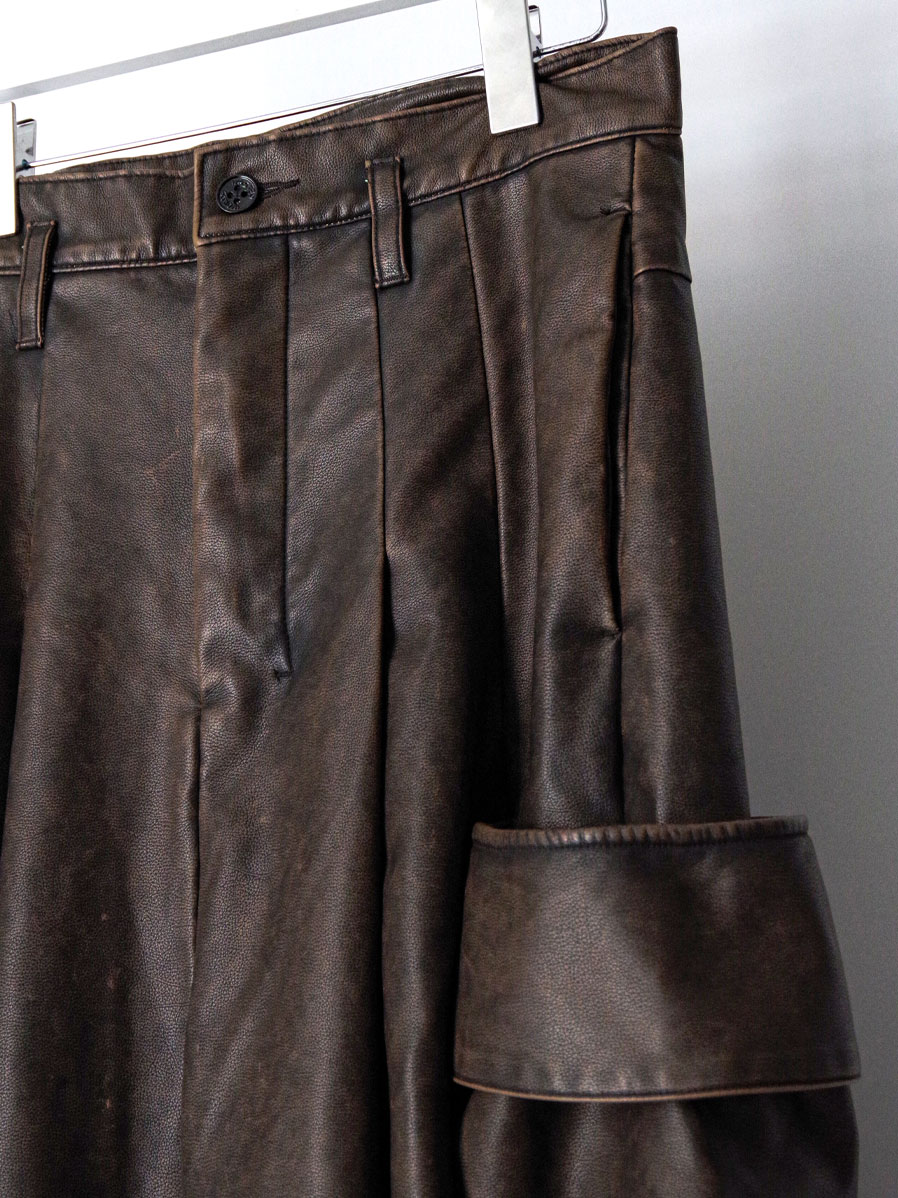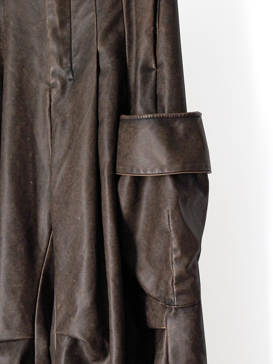 素材には、しなやかな落ち感とヴィンテージのような質感を併せ持つフェイクレザーを採用し、存在感とモードな空気感を漂わせています。