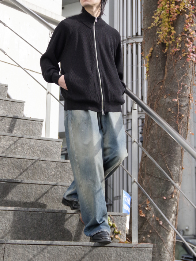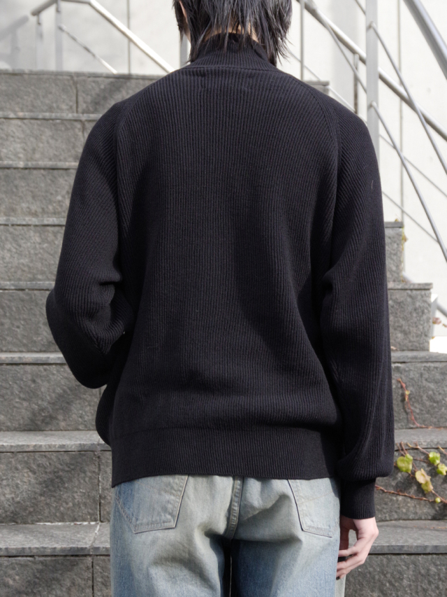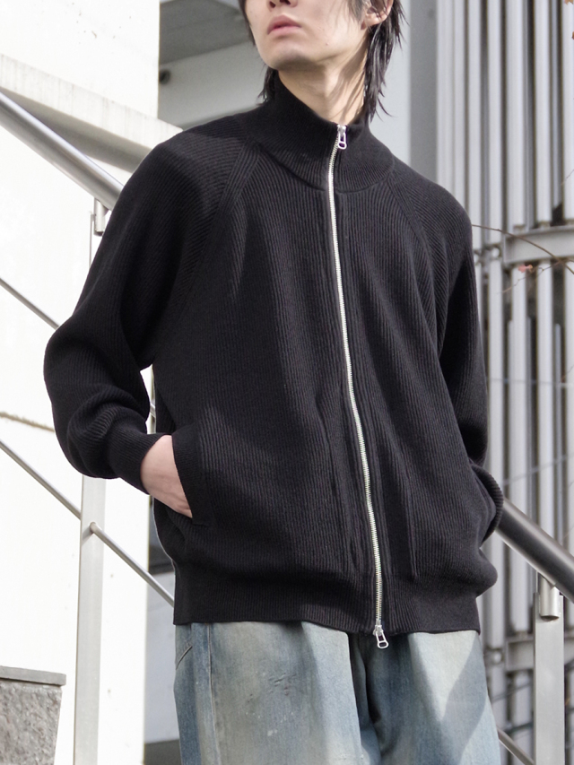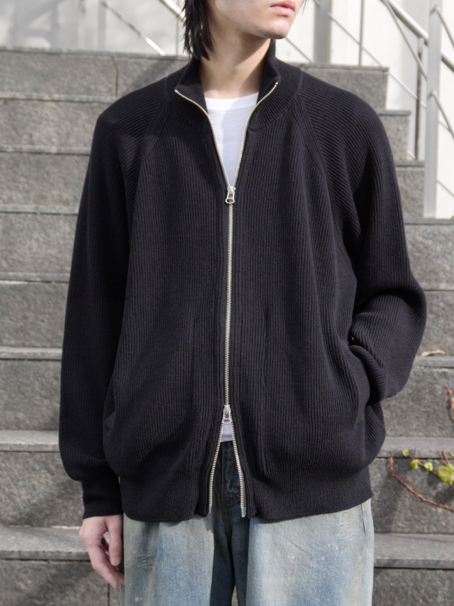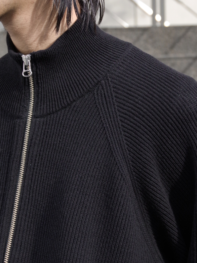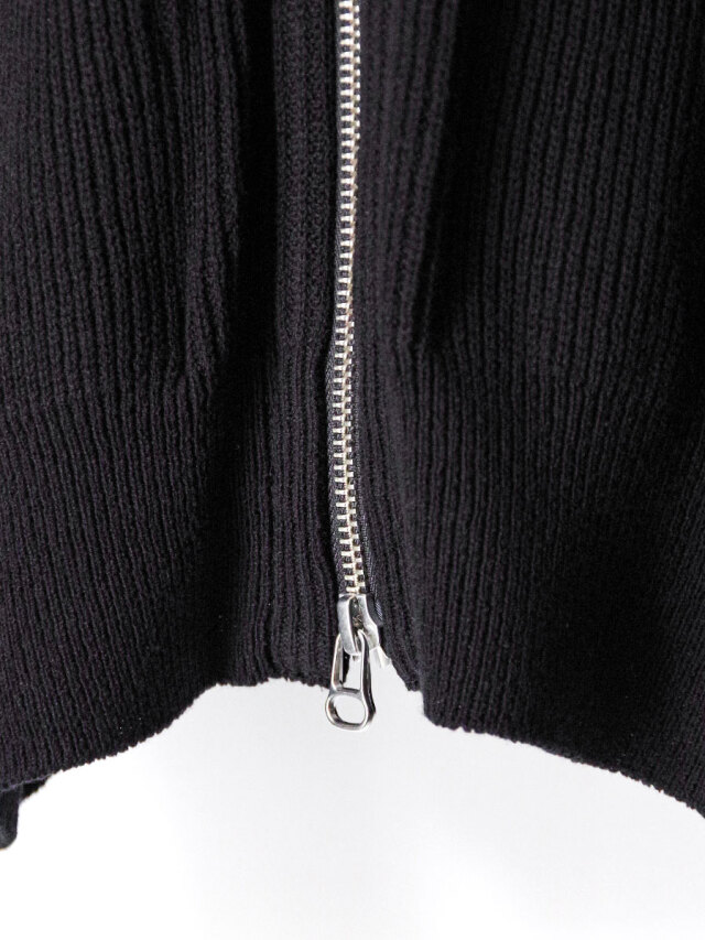 While the body and sleeves offer generous volume, the knit structure remains minimal, and unnecessary details are eliminated to create a refined and elegant appearance. Depending on how the zipper is styled, the garment can shift effortlessly between a clean, structured look and a more relaxed mood.