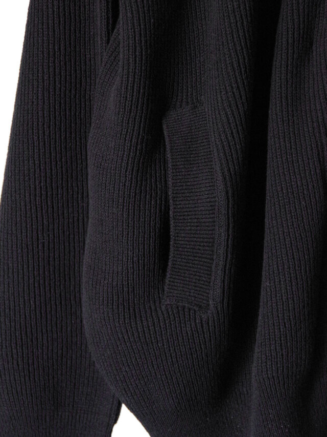 身頃やアームに十分なゆとりを持たせながら、編み地はあくまでミニマルに、装飾を削ぎ落とすことで上品で洗練された佇まいに仕上げています。ジップの開閉や着こなし次第で、きちんと感のある印象からリラックスしたムードまで、表情を自在に変える汎用性の高い一着です。