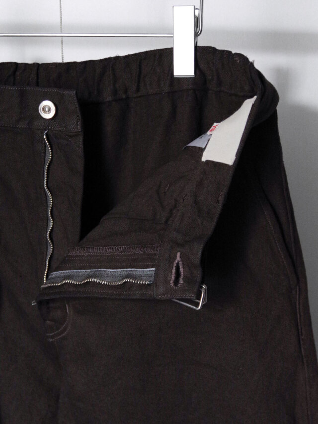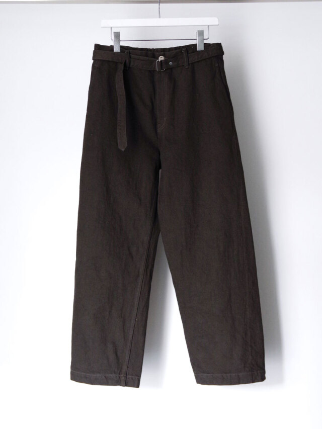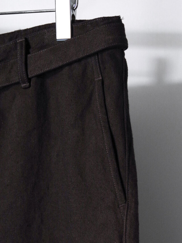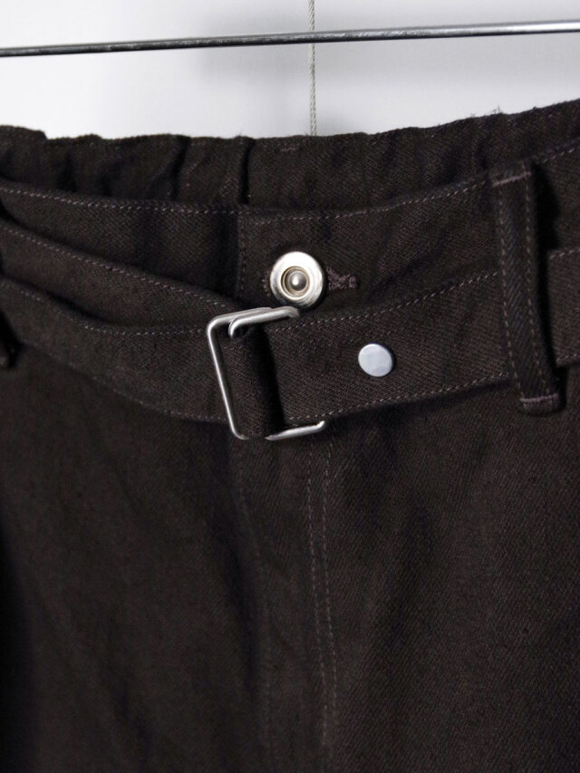 Belted denim trousers dyed with kakishibu (persimmon tannin).