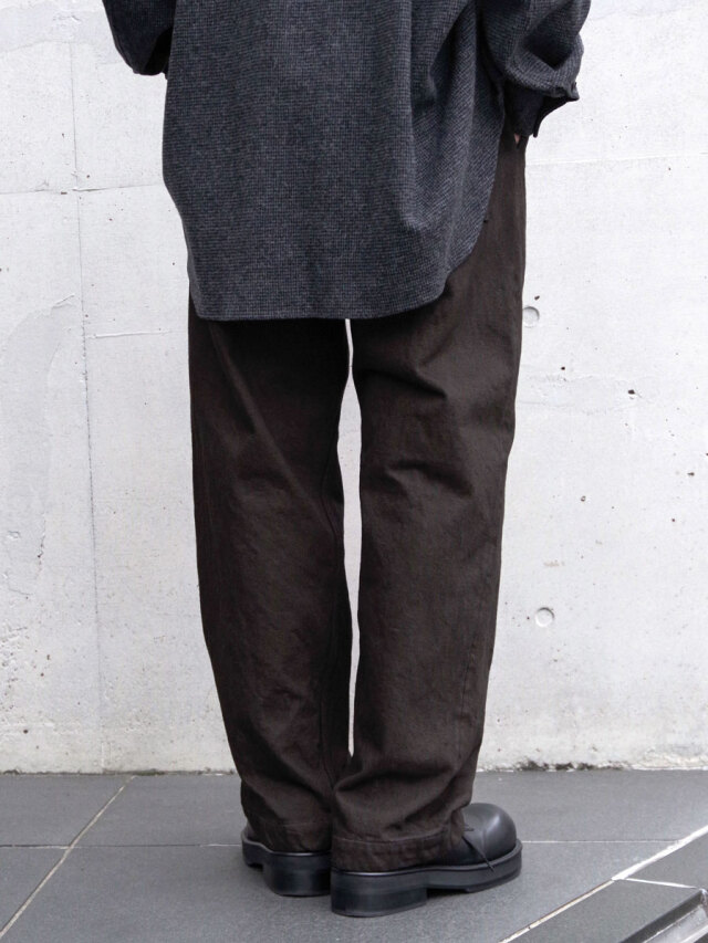 後身頃にゴムを配し、リラックスした穿き心地を叶えながらも、ワイドストレートのシルエットで存在感を放つ一本。共生地で製作されたロングベルトが付属し、垂らしてアクセントとしても楽しめます。タックボタンには鉄製の無塗装ボタンを採用しており、時間の経過とともに錆が生じ、味わい深い表情へと育っていきます。