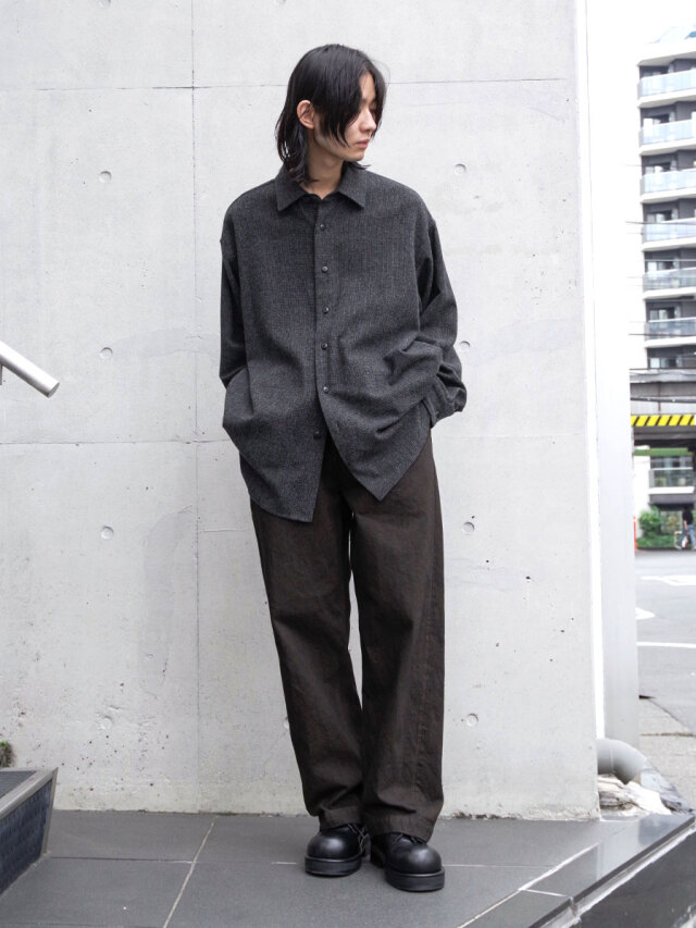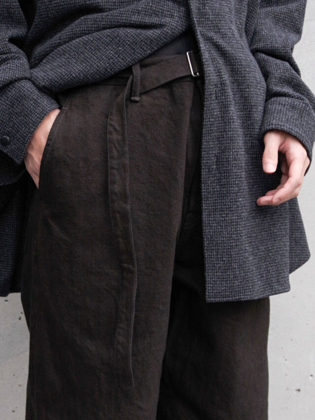Designed for comfort and presence, the trousers feature an elastic back waist for a relaxed fit and a wide straight silhouette. A matching long belt made from the same fabric adds a distinctive accent when left to drape. The tack buttons are made of uncoated iron, which will naturally oxidize over time, developing a rich patina and vintage-like character.