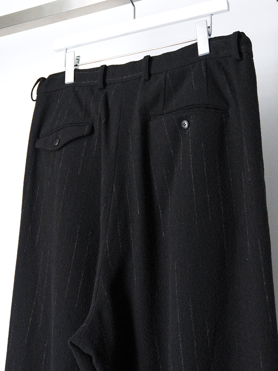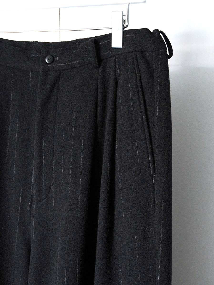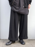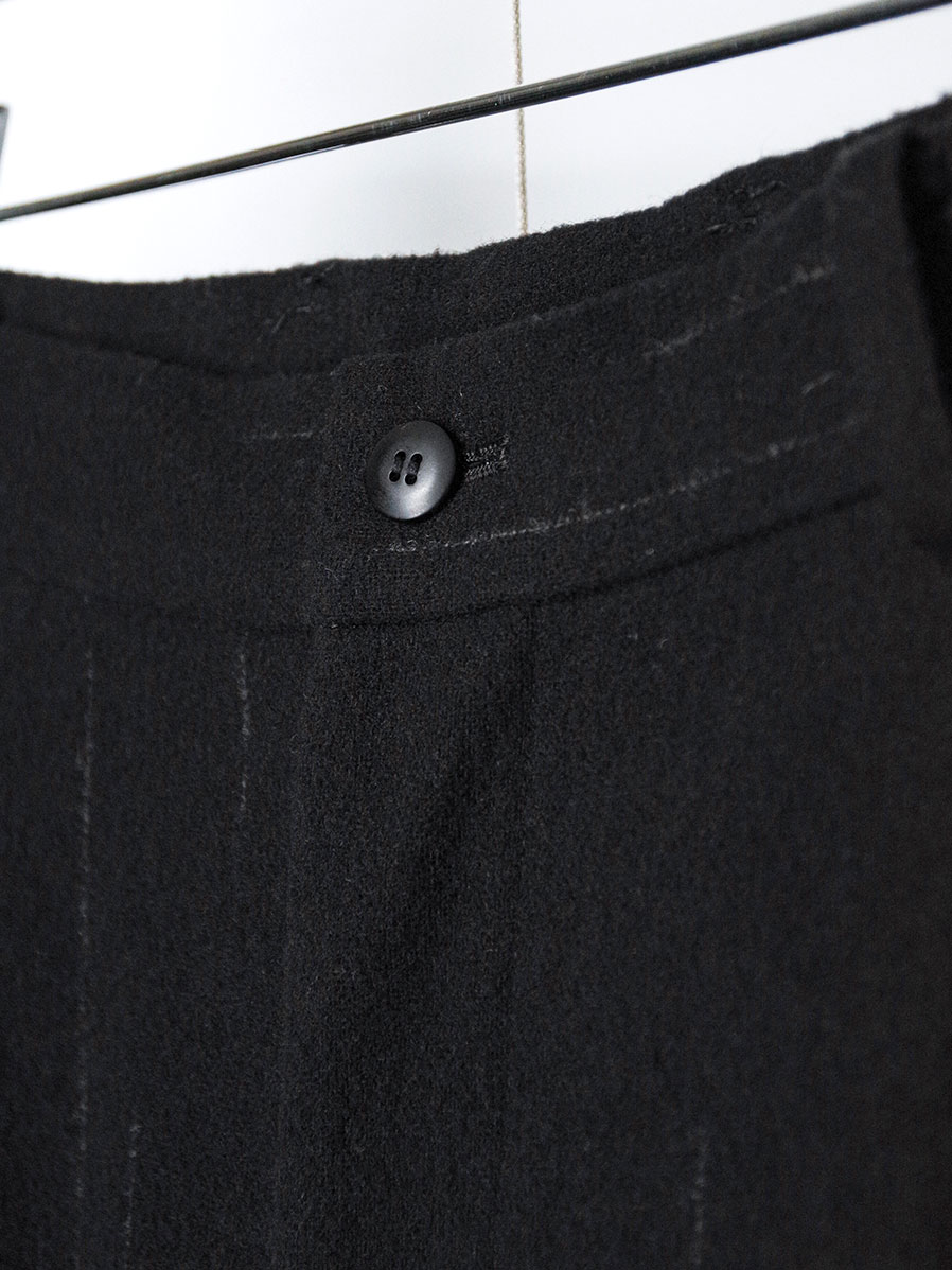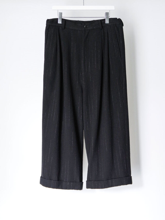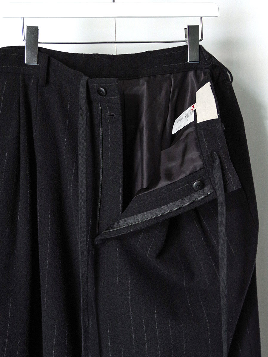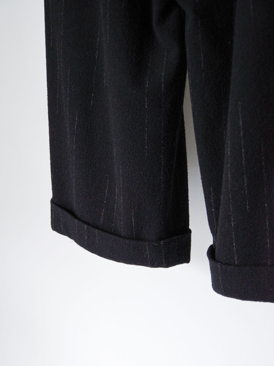 ハンドメイドのアンティークスラックスをベースに再構築された、フロント2タック仕様・ウエストドローストリング付きのクロップドワイドトラウザー。