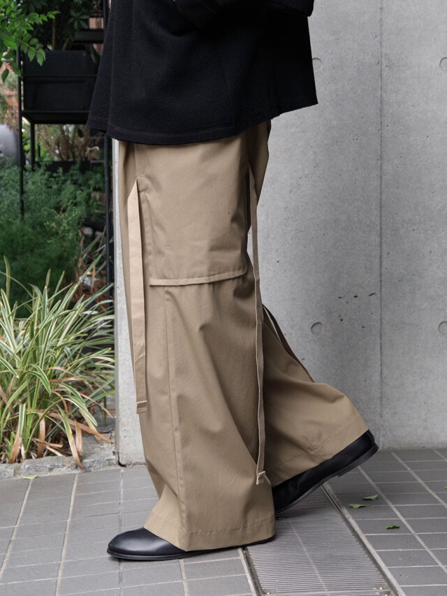 腰元には3本の深いタックを設け、袴のようにふわりと広がる立体的なシルエットを形成。どこか“和”のエッセンスを感じさせる佇まいに仕上げられています。