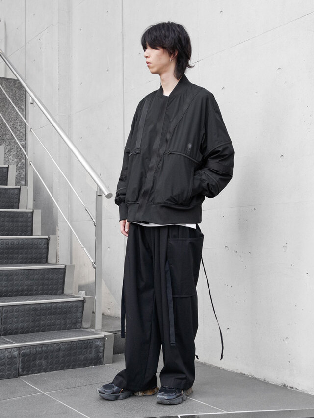 両サイドから垂れるテープは、動きの中で自然に揺れ、スタイリングのアクセントとして機能。テープの付け根にはポケット内に通じるホールを設けており、収納してよりミニマルな印象にもアレンジ可能です。