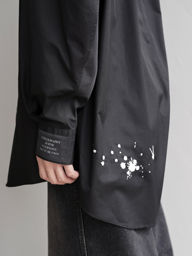 前後の身頃裾には飛び散った墨をイメージした刺繍をあしらい、アクセントに。ブラックベースの生地にプリントではなく敢えて手のこんだ刺繍を施すことで、立体感が増しその存在感を輝かせています。