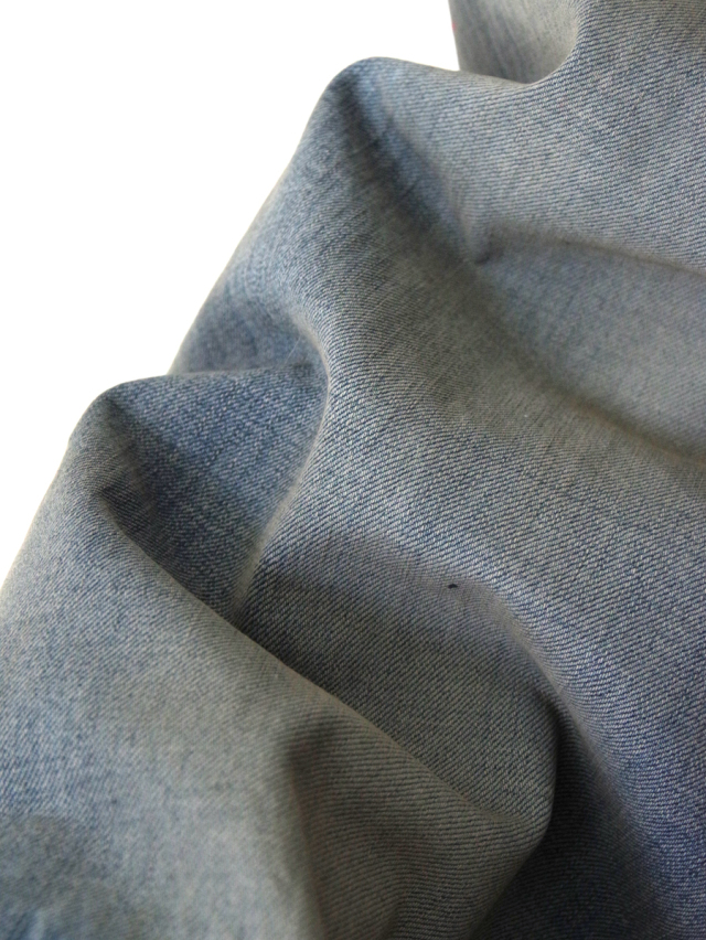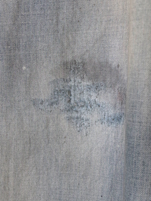 Starting with a richly toned denim base, hand-rubbed fading creates layered gradations with visual depth. Small holes and subtle stains are positioned with careful balance, each applied by skilled craftsmen by hand, producing a powerful yet controlled contrast.