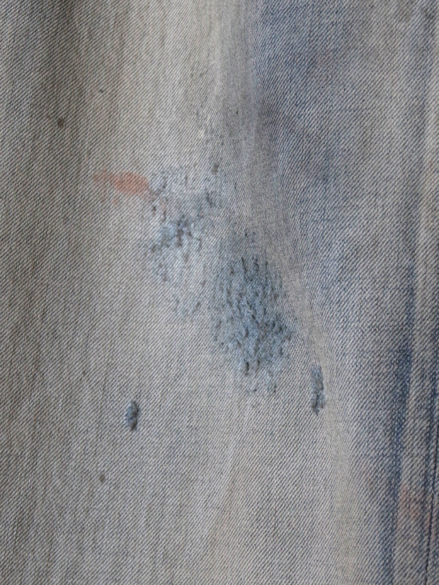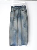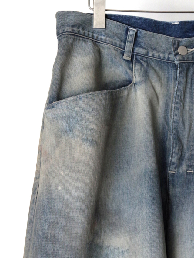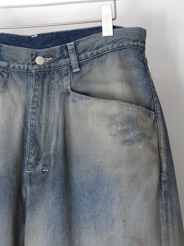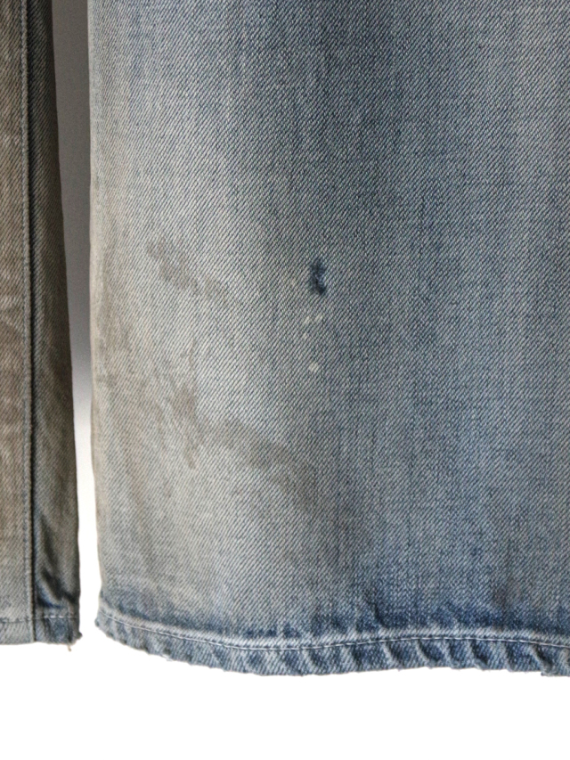 色味の強いデニムをベースに、手擦りによってフェードを生み出し、奥行きのあるグラデーションを形成。さらに小穴や小さな汚れに至るまで一つひとつバランスを見極めながら位置を定め、職人が一点一点手作業で仕上げることで、迫力あるコントラストを描き出しています。
