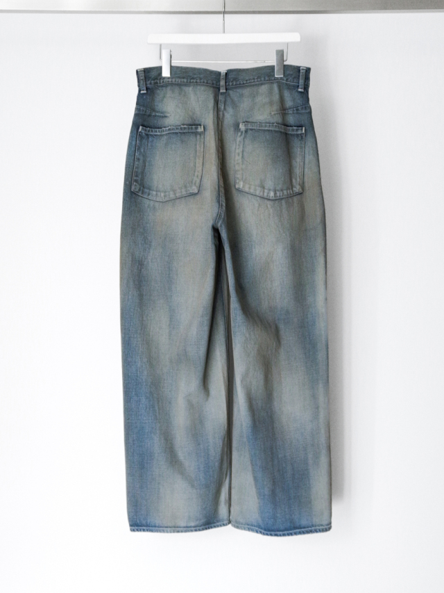 スラックスのパターンを応用することで、一般的なデニムとは異なるややドレッシーなアウトラインを描いています。着用時の美しい落ち感や、ポケットの自然な膨らみまで計算し、独自のパターンで構築。立ち姿が端正に映る設計です。