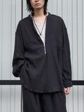 A long half-zip at the front allows the look to change depending on how it is worn. Fully zipped, it presents a clean band-collar shirt appearance. Lowered slightly, it introduces a relaxed yet refined urban feel. When opened further, it creates a more fashion-forward expression, ideal for layering with innerwear or necklaces.