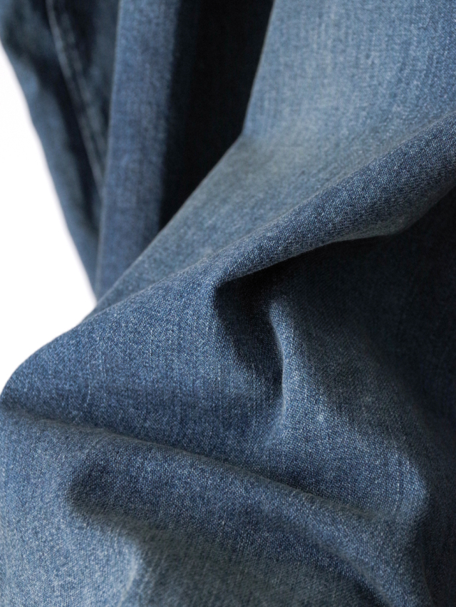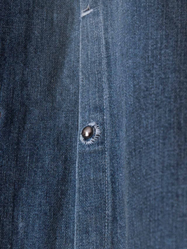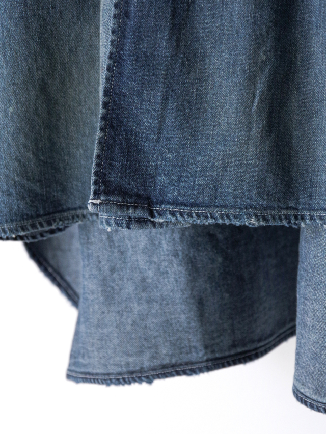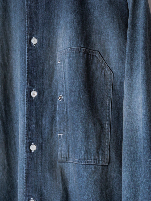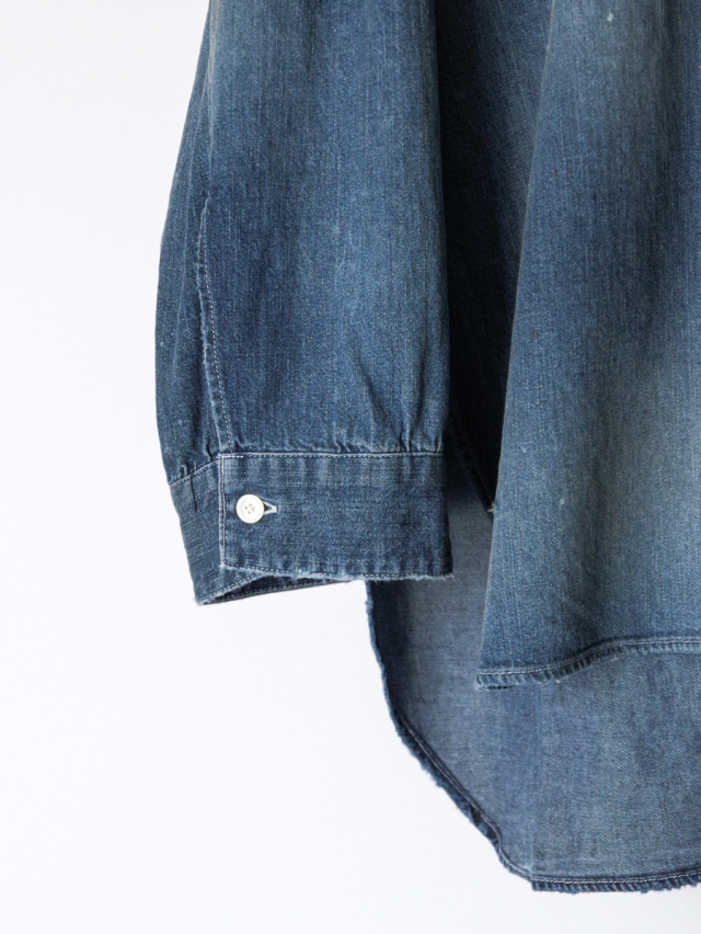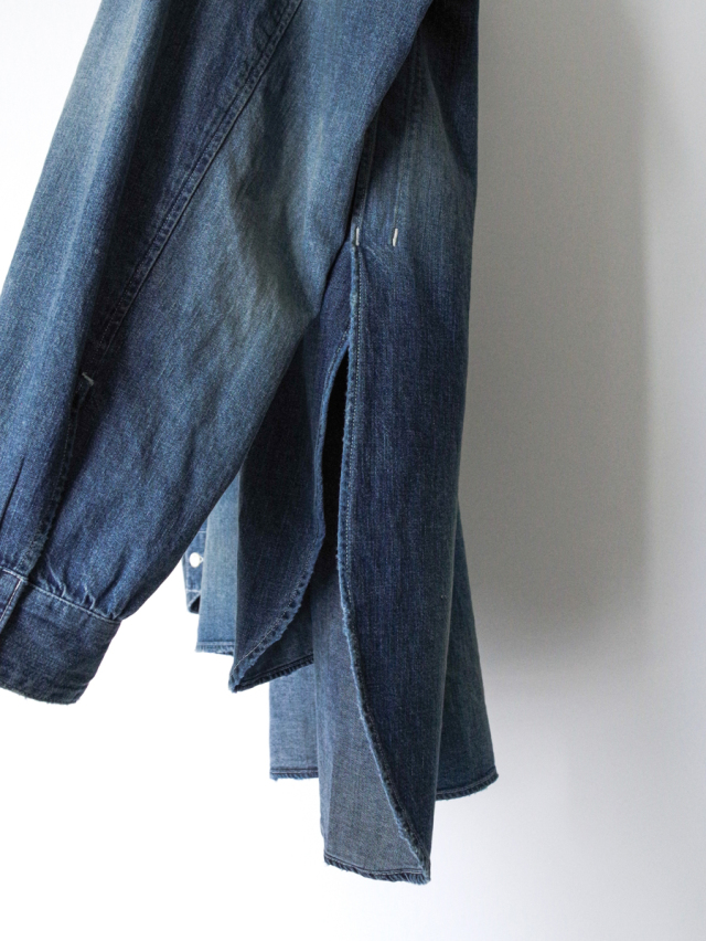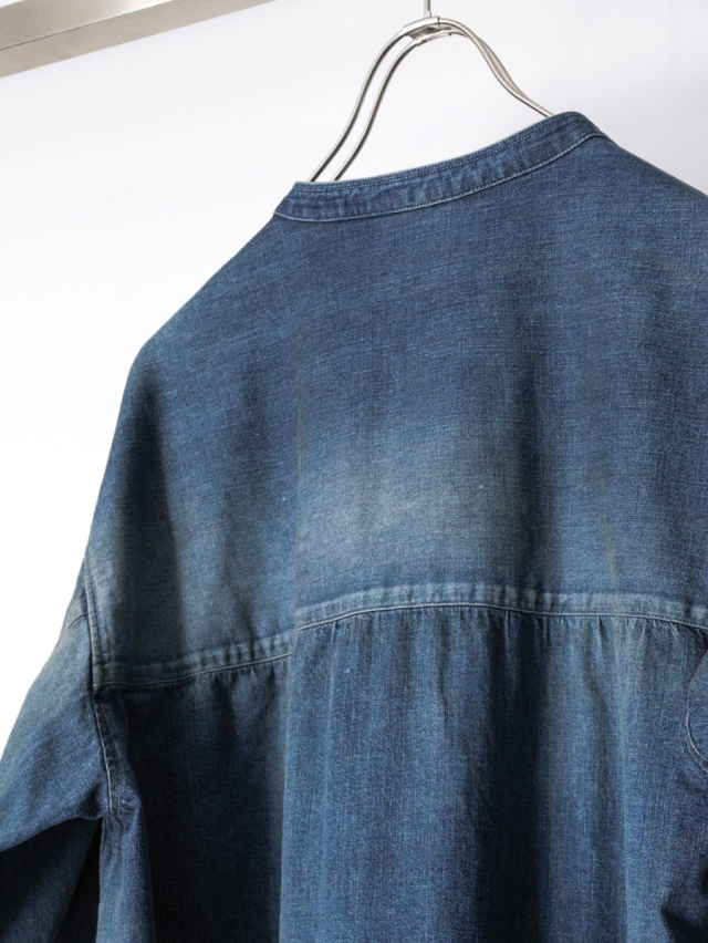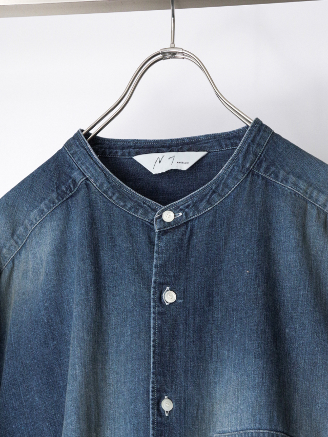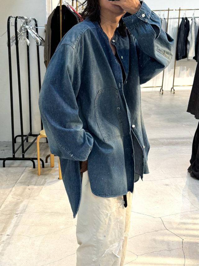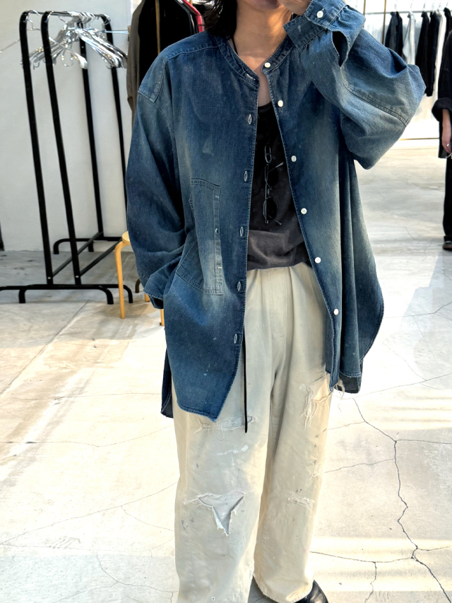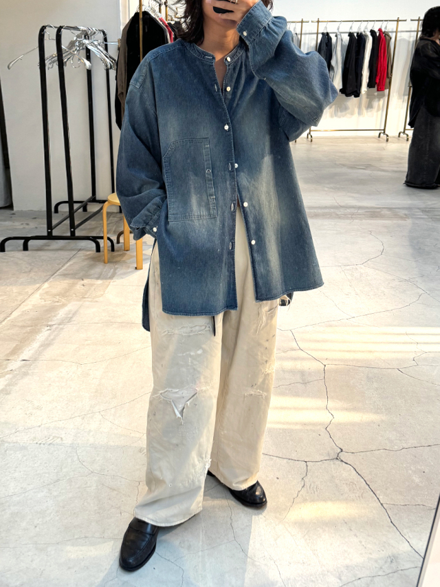 従来のベーシックなデニムシャツとは一線を画し、ノーカラーかつロング丈に設定することで、よりファッション性の高い一着に仕上げられています。