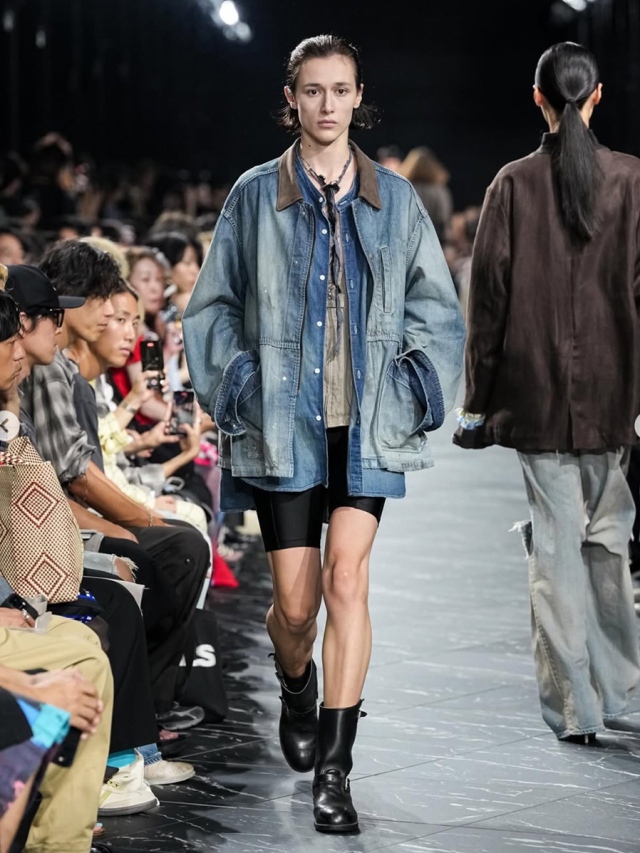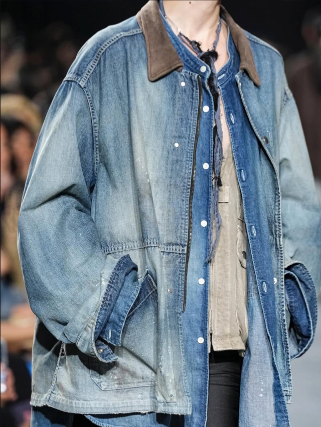 Moving away from conventional denim shirt designs, this piece features a collarless construction and an elongated length, resulting in a more fashion-forward silhouette.