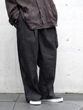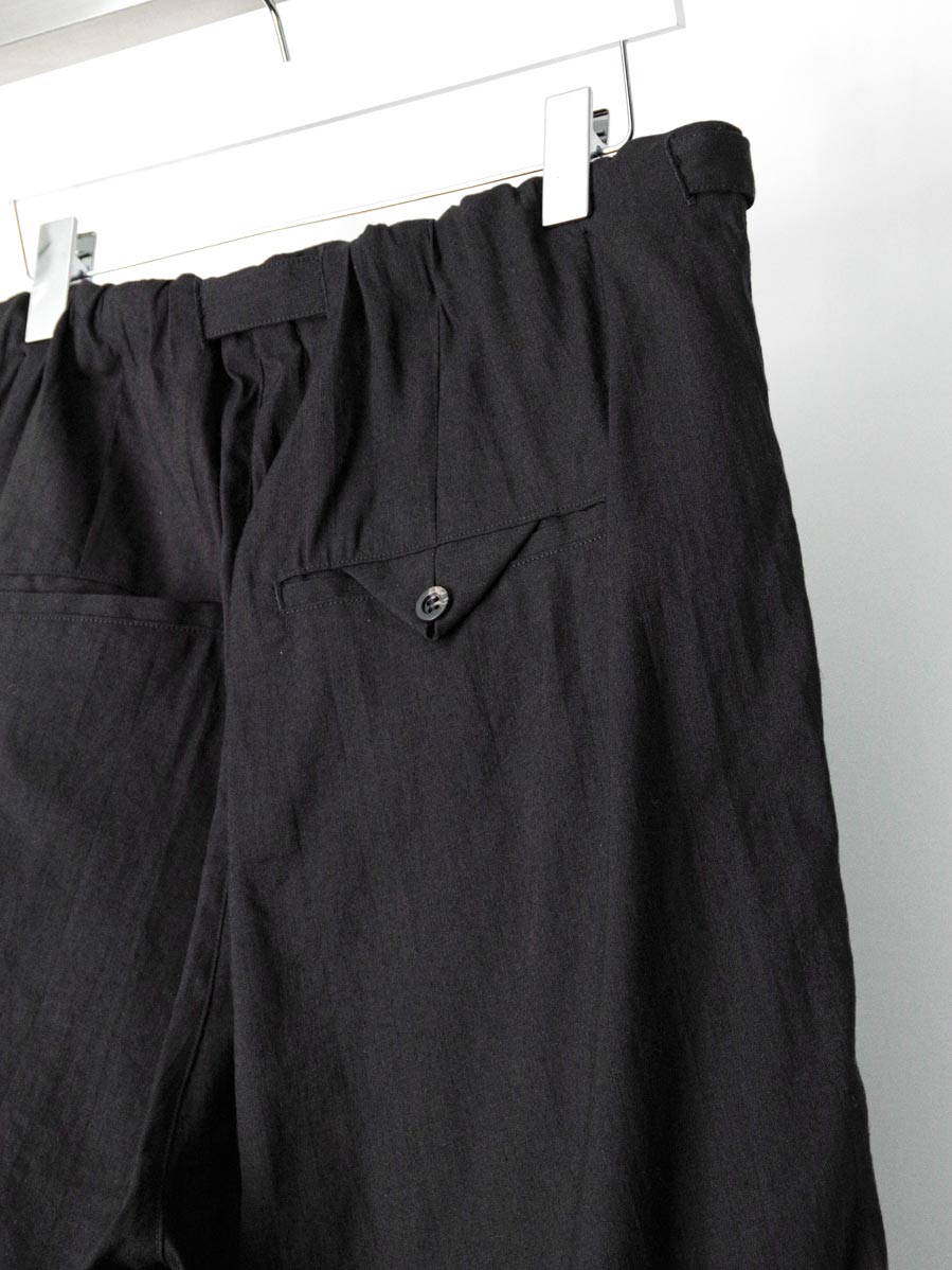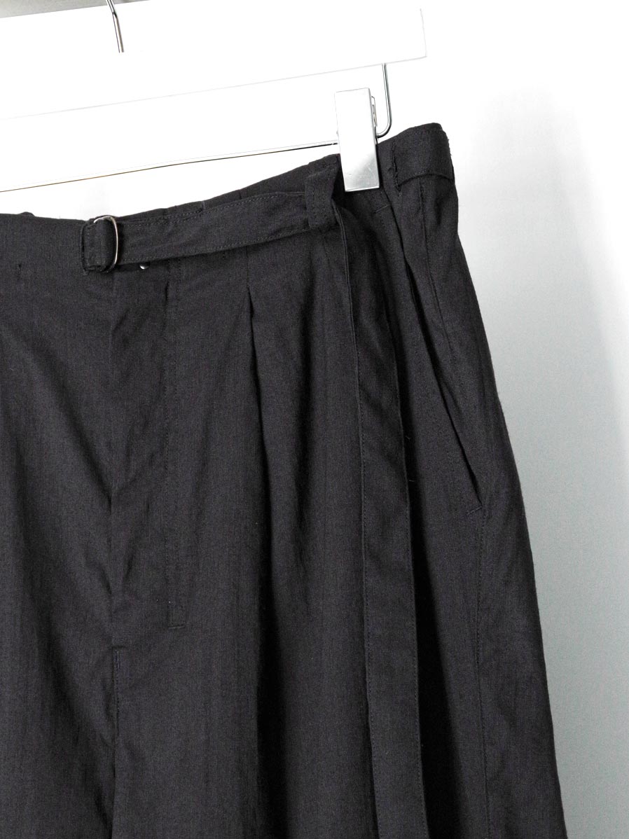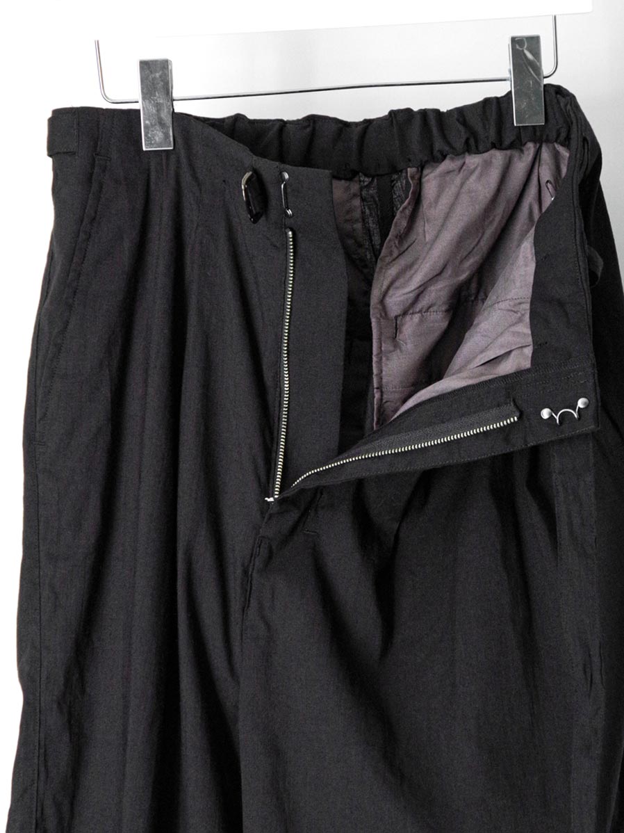 The natural firmness of the fabric is softened through a special finishing process, allowing the trousers to fall beautifully with a smooth drape. Fine irregularities in the weave create depth in the surface, while the tucks generate flowing movement as the fabric shifts.