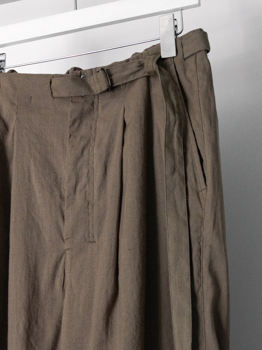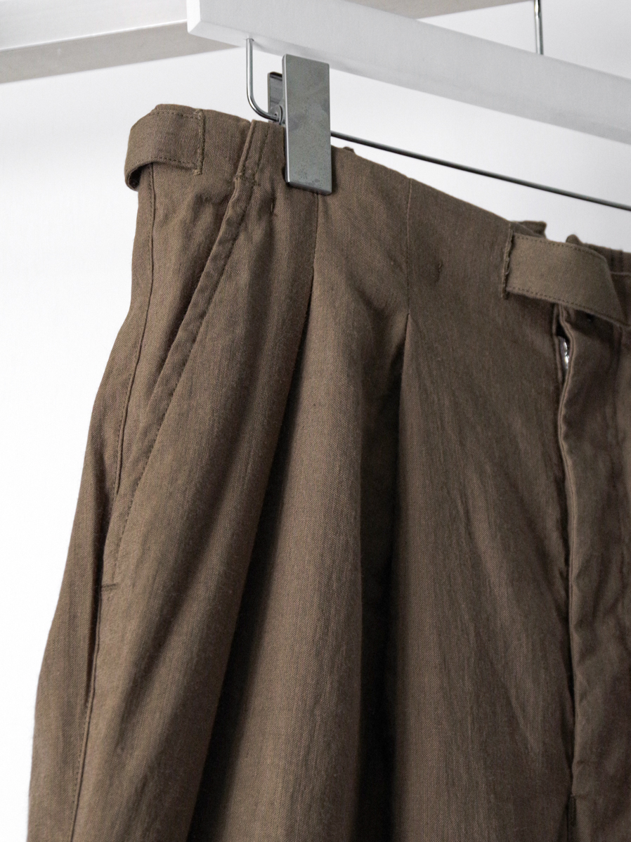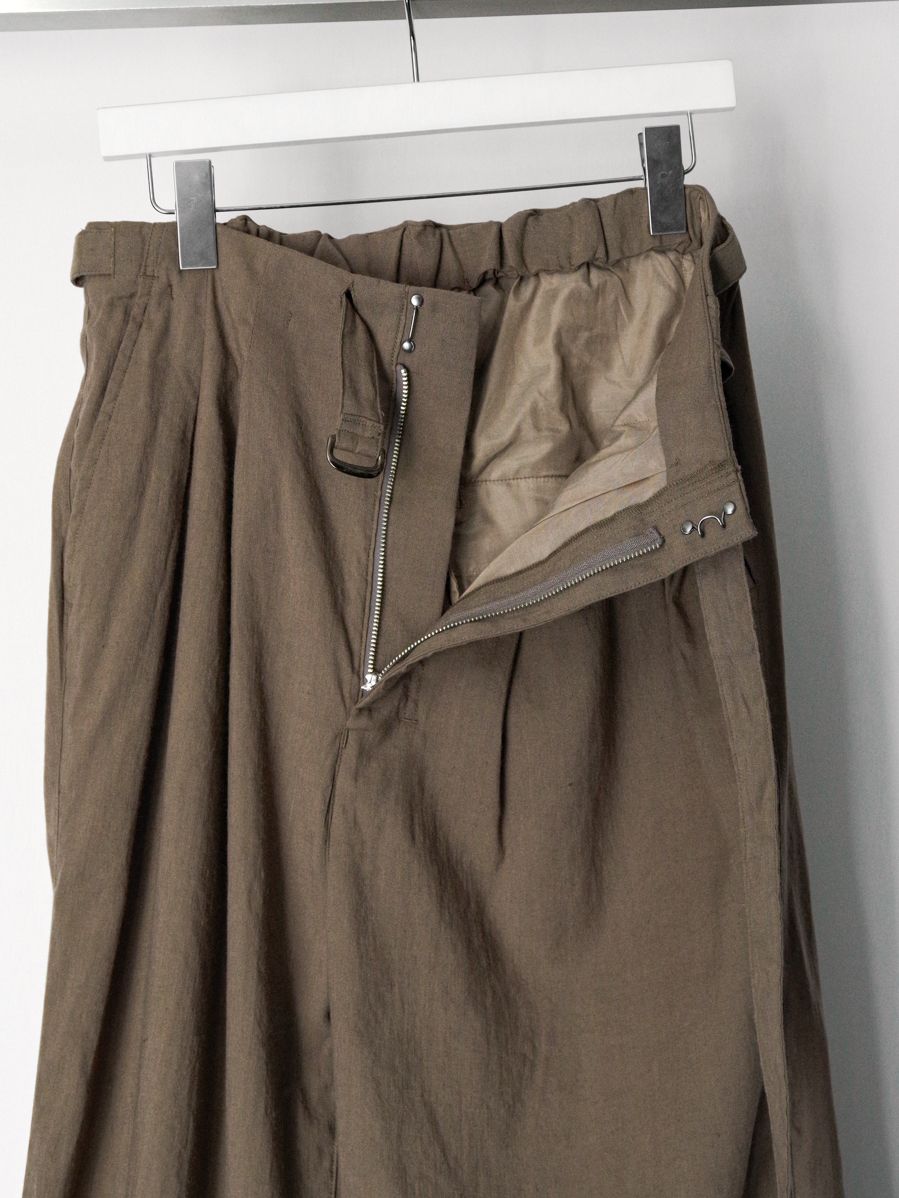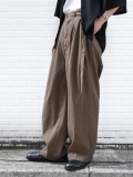 The natural firmness of the fabric is softened through a special finishing process, allowing the trousers to fall beautifully with a smooth drape. Fine irregularities in the weave create depth in the surface, while the tucks generate flowing movement as the fabric shifts.