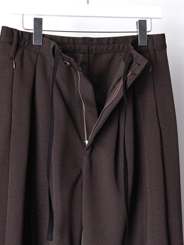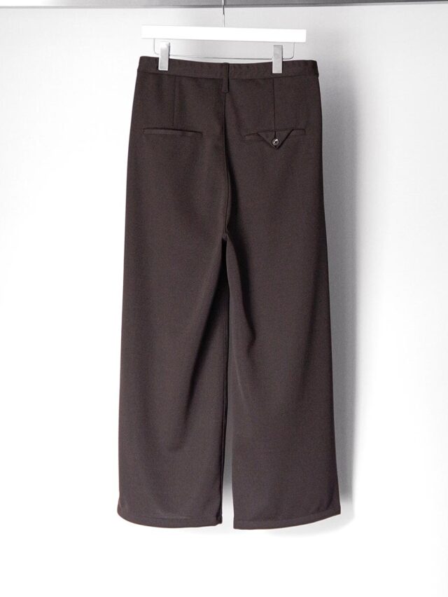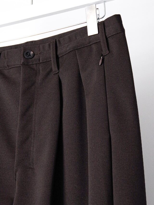 快適なジャージー素材を用いながらも、構造はスラックスをベースに設計。カジュアルな素材感と端正な佇まいを両立させています。