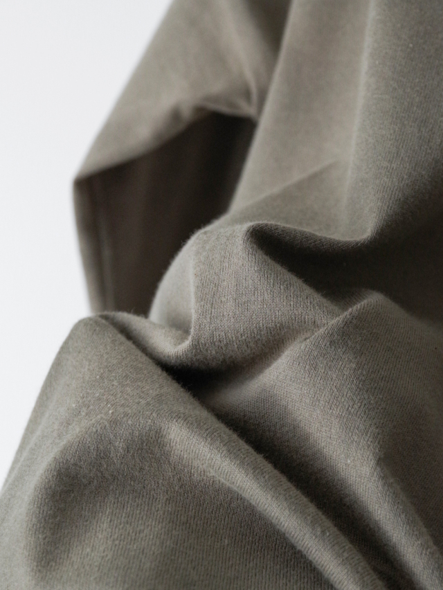 Unlike conventional cotton jersey, it offers a melting softness paired with beautifully layered gradients, resulting in a simple yet visually rich expression.