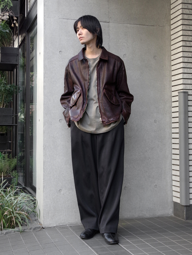 By applying an original dyeing technique to the custom-made fabric, the natural texture of the material and the depth of the coloration are fully realized.