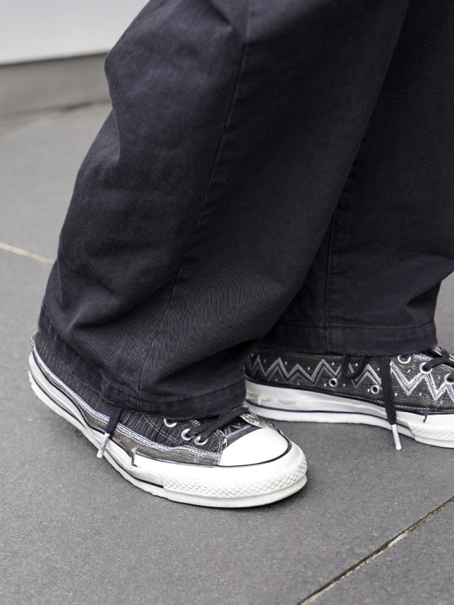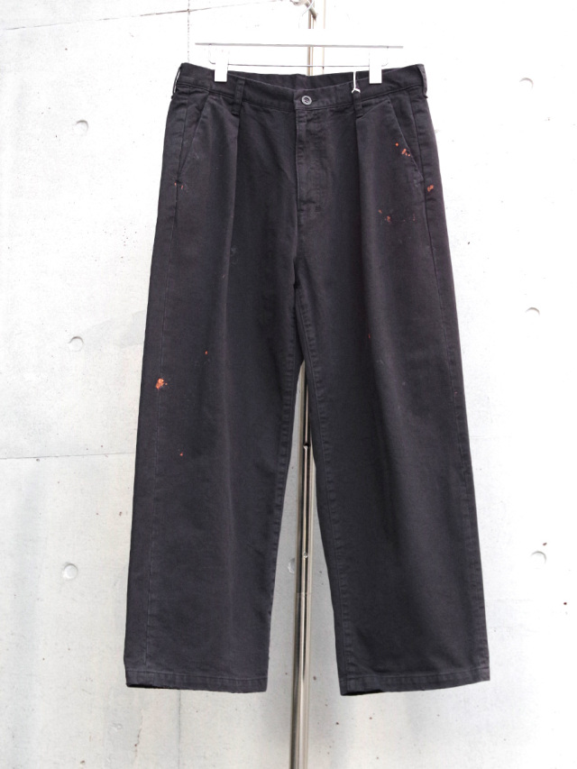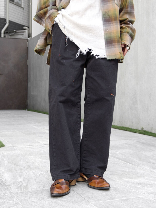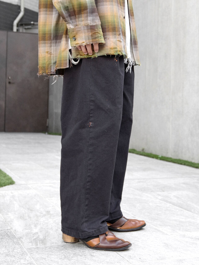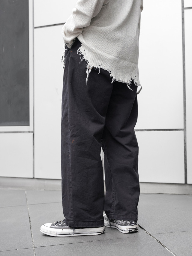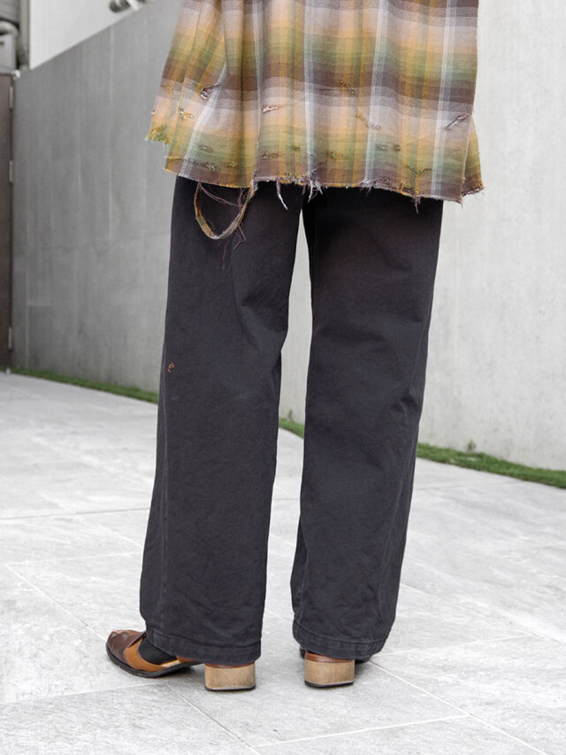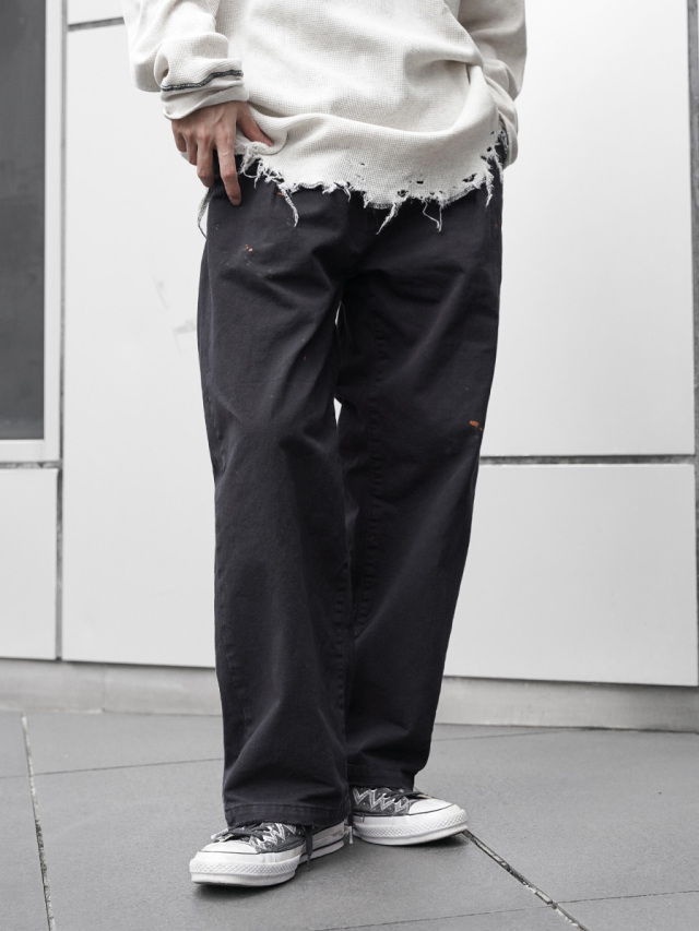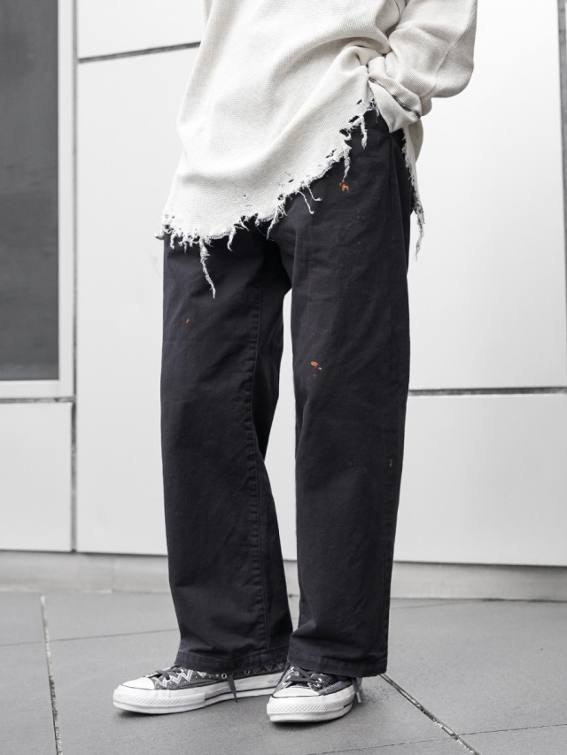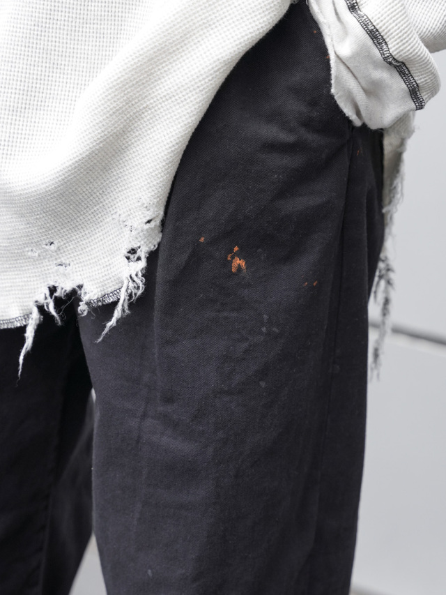 ペイント加工が施されたチノトラウザーズ。