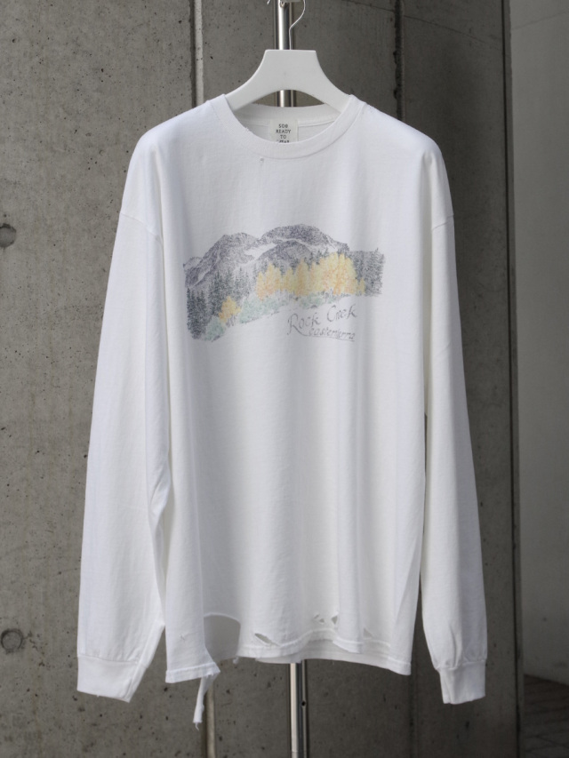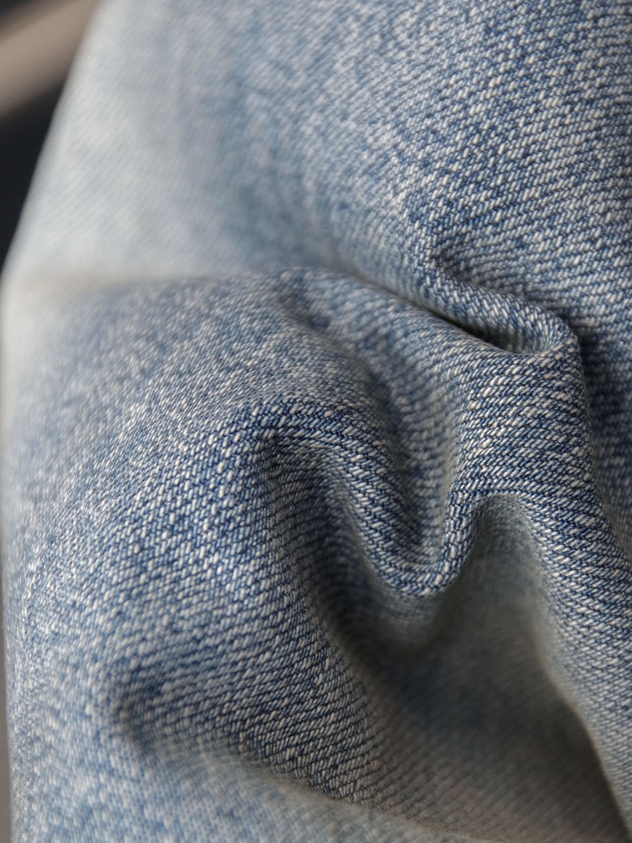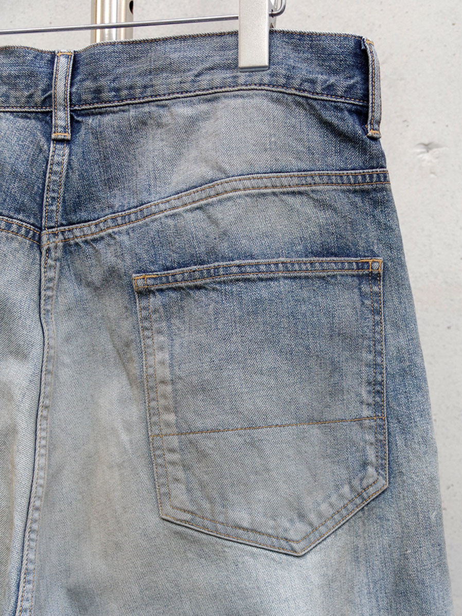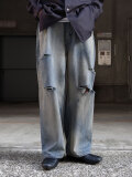 定番のワイドデニムに夏らしいクラッシュ加工を施し、温暖な季節に映える色調で構成されたダメージデニム。大胆なクラッシュと美しいシルエットの対比が際立つ一本です。