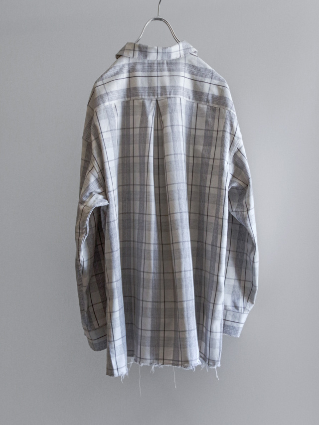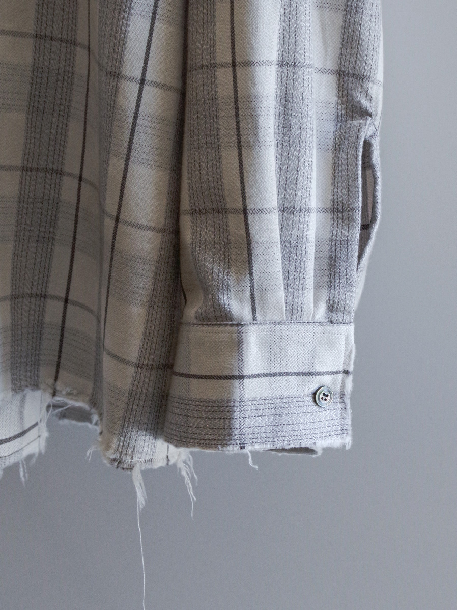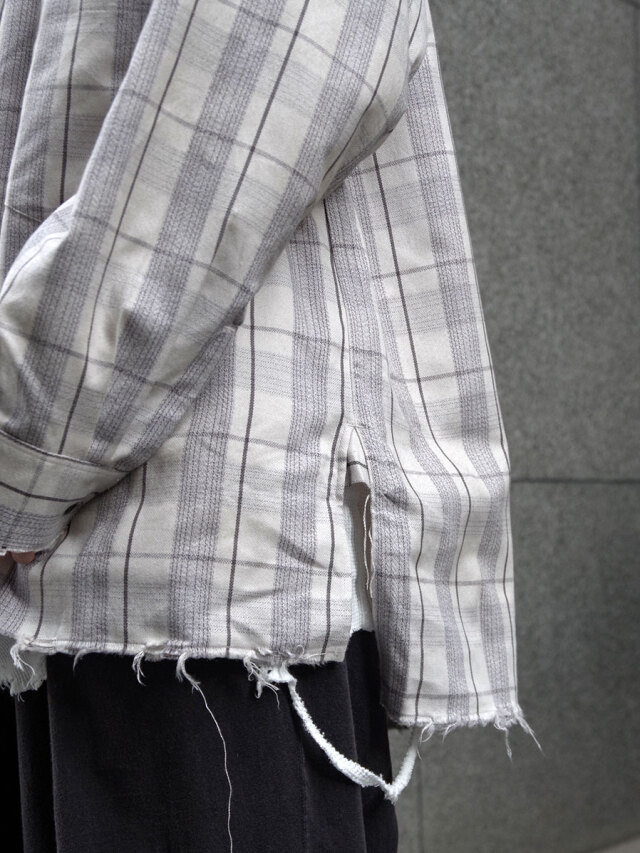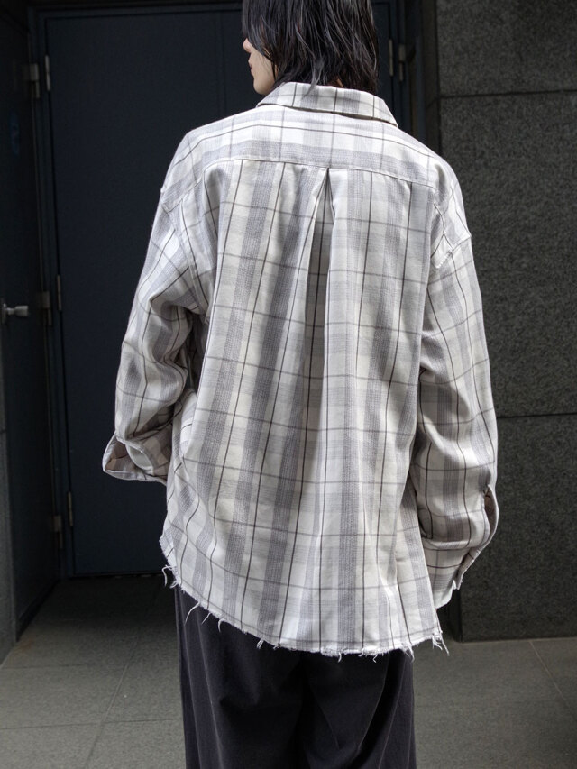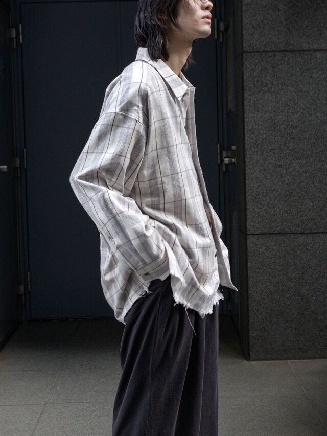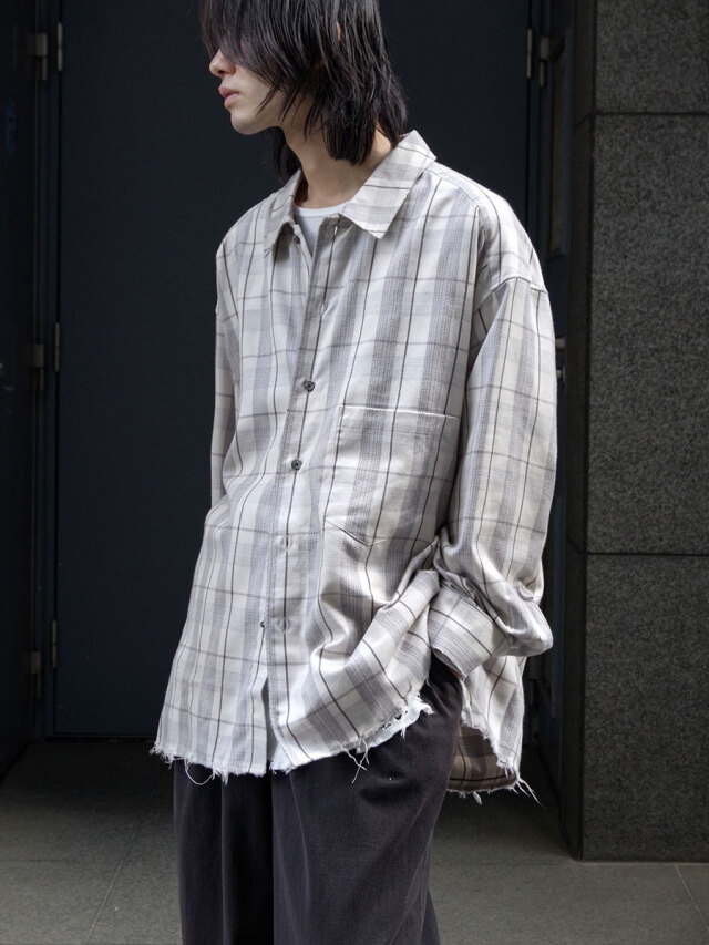 Random distressing is added in the finishing stage to give the shirt depth and character. The original cotton-rayon fabric combines structure with fluid drape, making it suitable for year-round wear. Its smooth texture feels gentle against the skin.