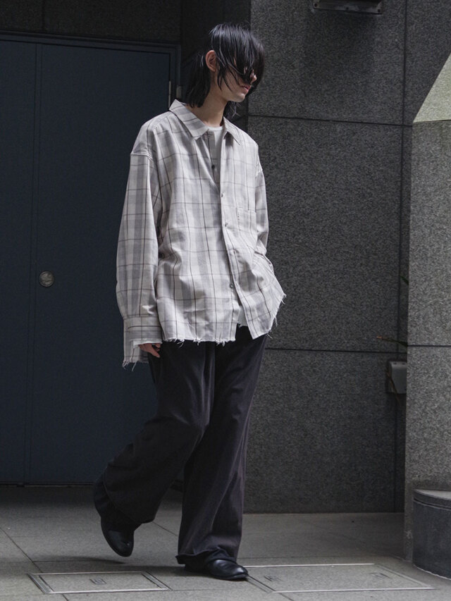 表情に奥行きを加えるため、仕上げにランダムなダメージ加工をプラス。素材はコットン×レーヨンのオリジナルファブリックで、ハリととろみを兼ね備え、季節を問わず活躍します。滑らかな肌触りも魅力。
