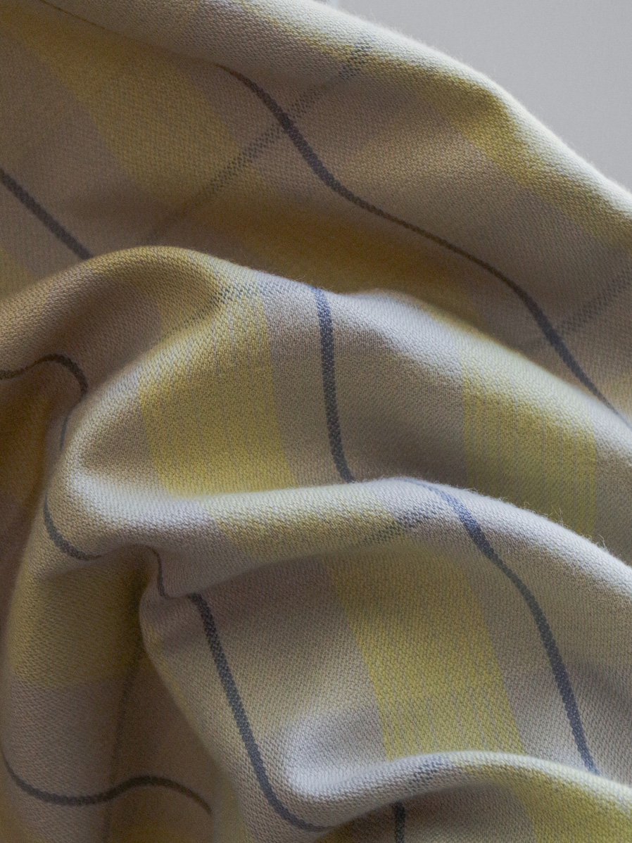 カラーは懐かしさと風情を感じさせるGRAYと、重いトーンに差し色を添えるYELLOW。格子のバランスをミリ単位で追求し、現代の技術で織り上げた特別なチェック柄です。