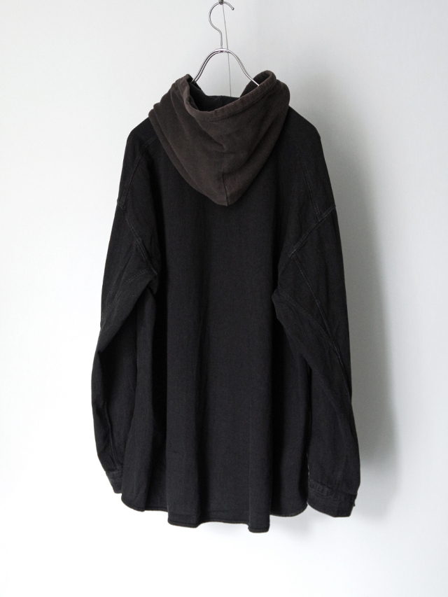 フードの上からシャツを重ねたように見えるフェイクレイヤード仕様のフーディシャツ。