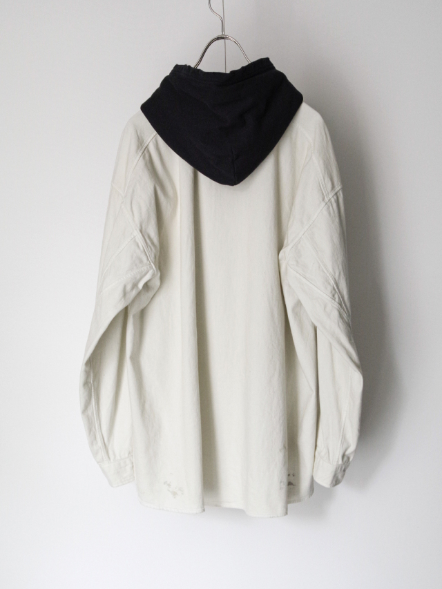 フードの上からシャツを重ねたように見えるフェイクレイヤード仕様のフーディシャツ。