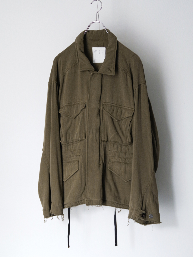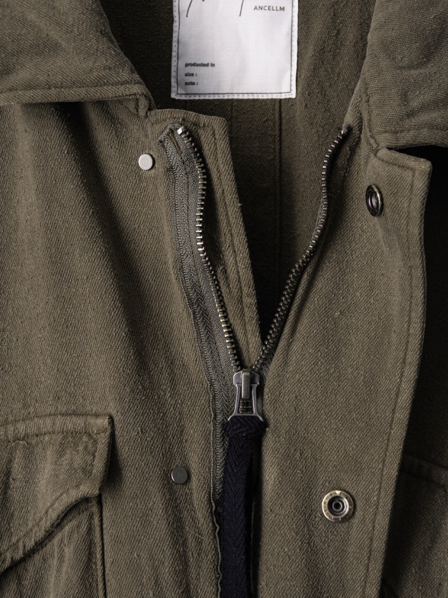 A military-inspired field jacket crafted from 100% silk, using noil silk woven in a denim structure and treated to create a distinctively textured surface.