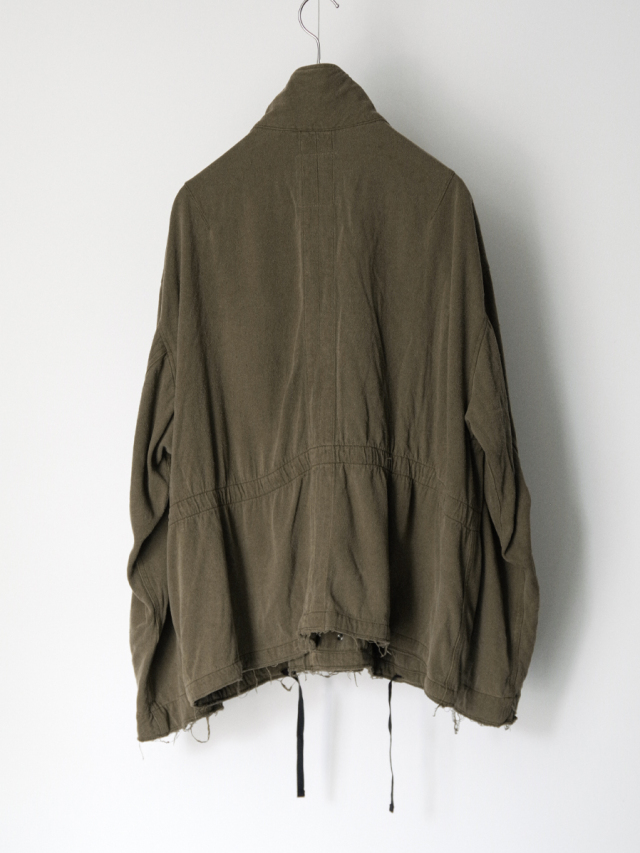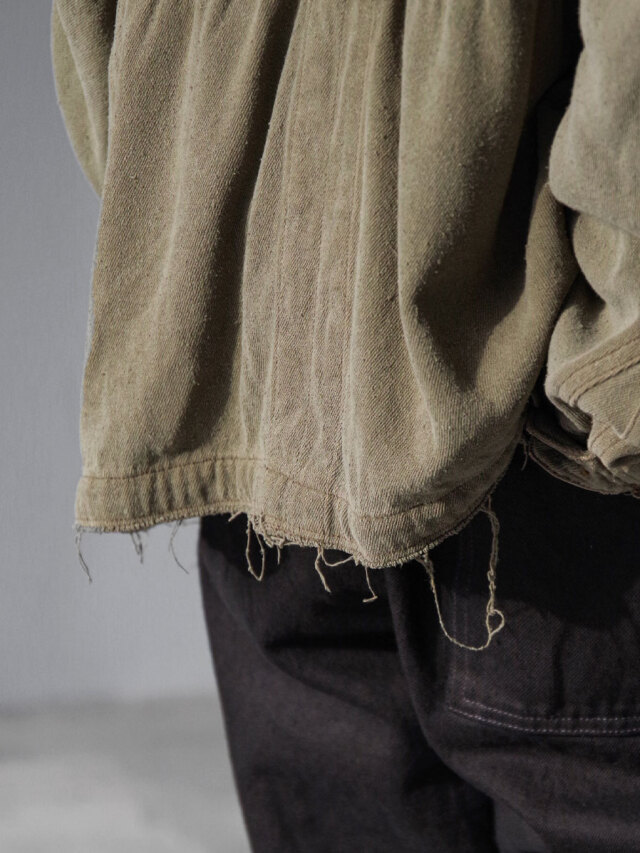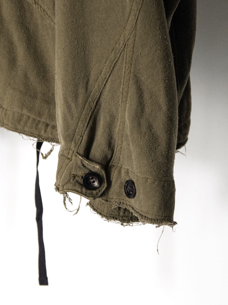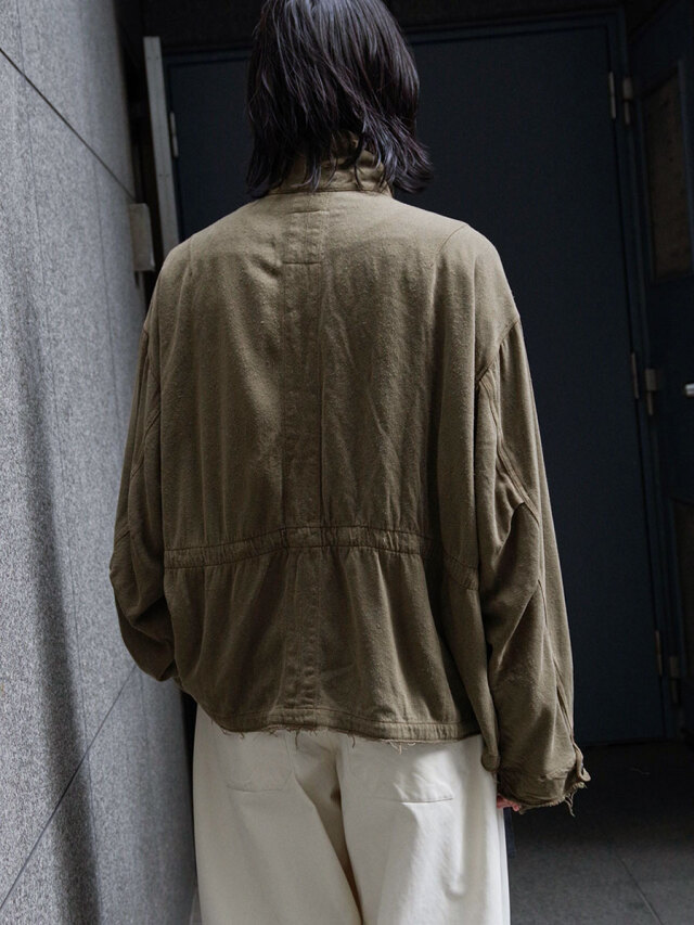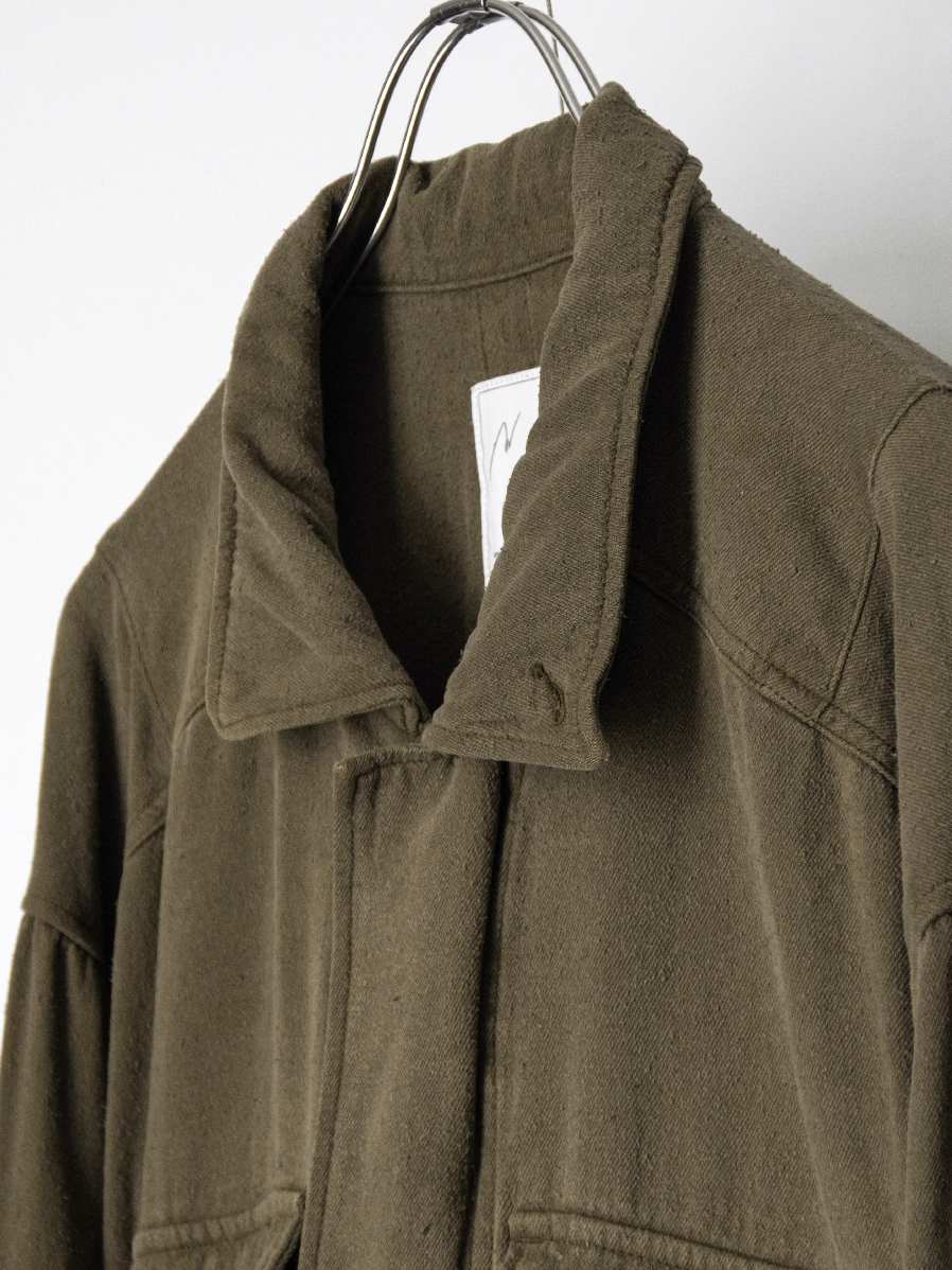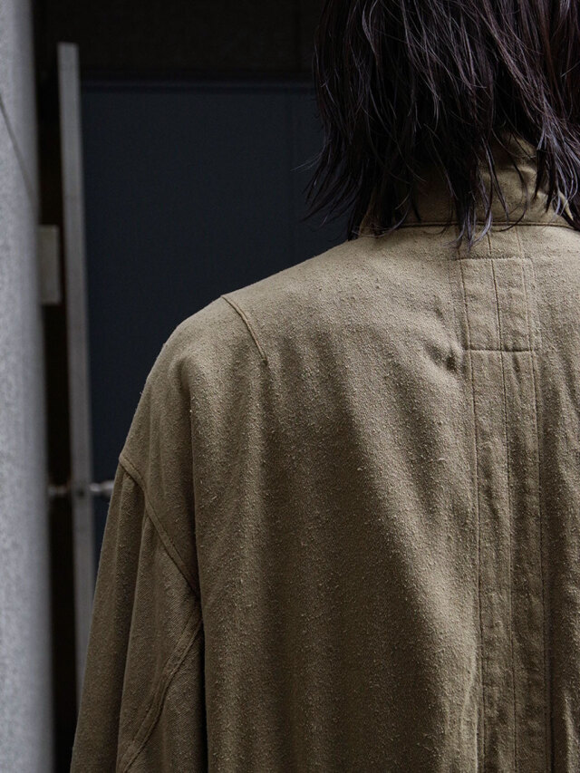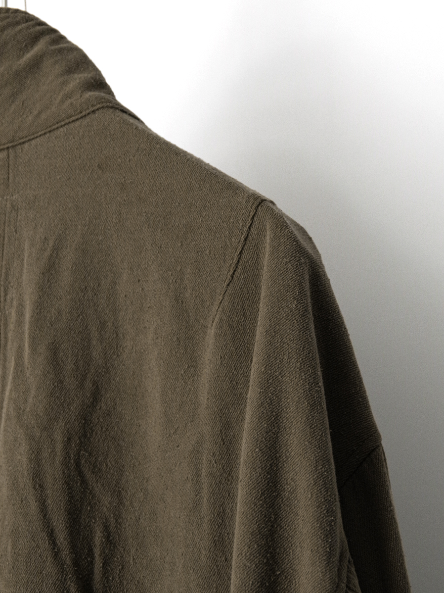 Washing the short-fibered noil silk causes the yarns to absorb moisture, releasing fibers and bringing out natural neps. Additional softening processes give it a relaxed drape and rustic character, offering a gentle, organic expression far removed from the glossy rigidity typically associated with silk. The result is a piece that combines fluid elegance with subtle ruggedness, reinterpreting the military archetype with refinement.
