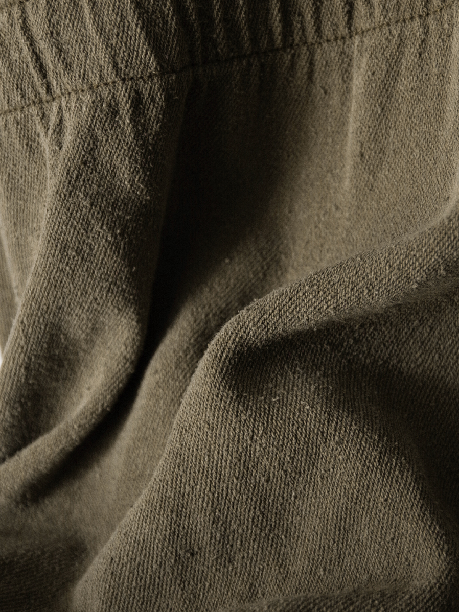 繊維長の短いノイルシルクに洗いをかけることで、糸が水分を含み繊維がほどけ、ネップが自然に浮き出る風合いに。さらに、柔らかくくったりとした加工を重ねることで、シルク本来の艶やかで硬質な印象とは異なる、素朴で味わい深い表情を表現しています。
