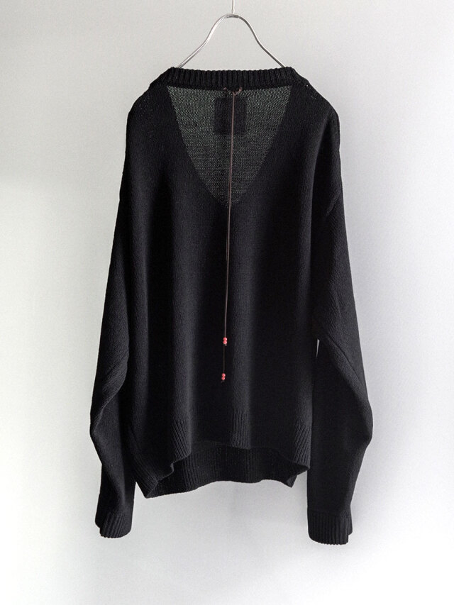 身幅と着丈をしっかりと取り、生地を贅沢に使用。脇や袖まわりに生まれる“溜まり”がニットでありながらも美しいドレープを描き、シンプルな中に確かな存在感を宿します。